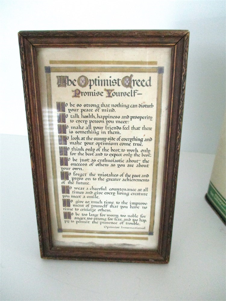• Framed Motto Print: “The Optimist Creed” in a small wooden frame. Popular inspirational motto print of early to mid-20th century.