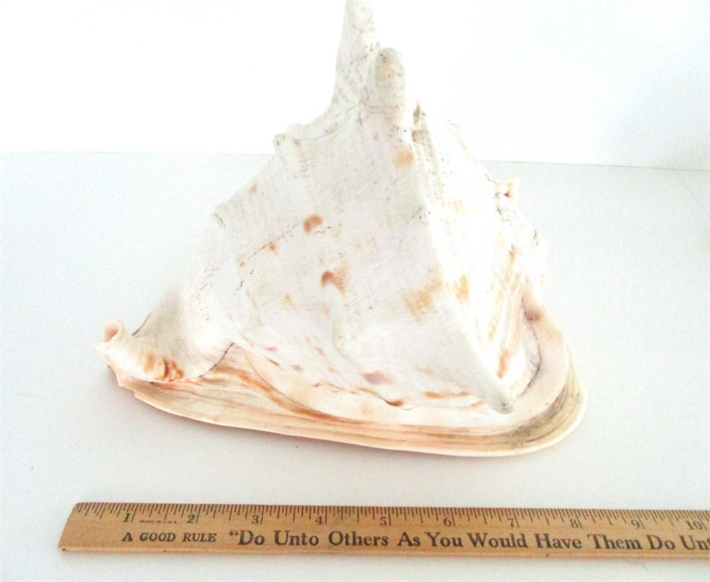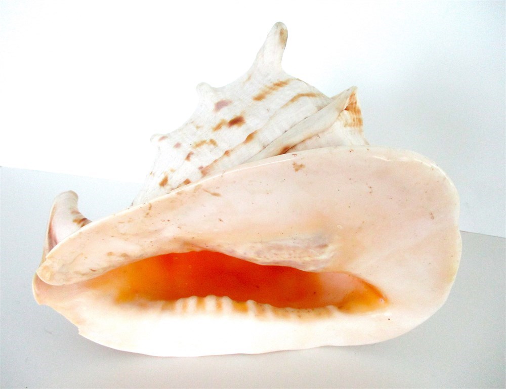 1. Spider Conch (Lambis Chiragra): Large shell with flared outer lip, displaying soft cream exterior and rich peach to orange interior. Indian Ocean, Pacific Islands, Philippines.  Approx. 9 in. long.