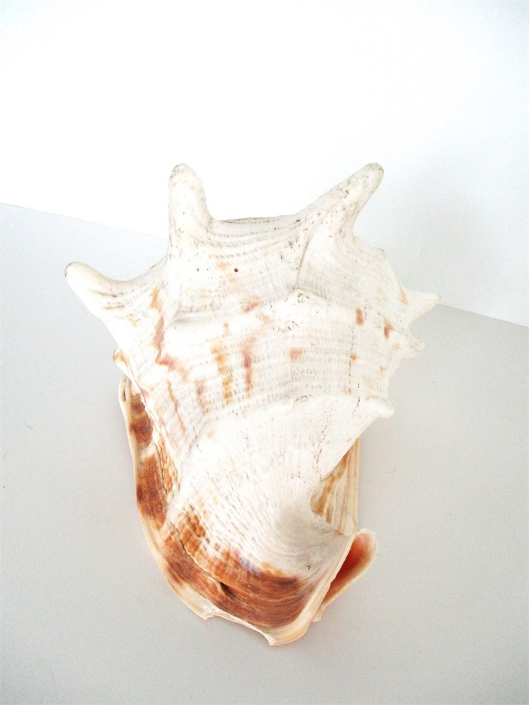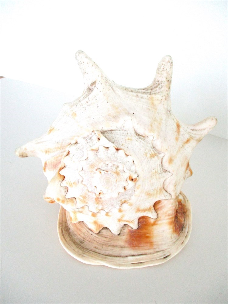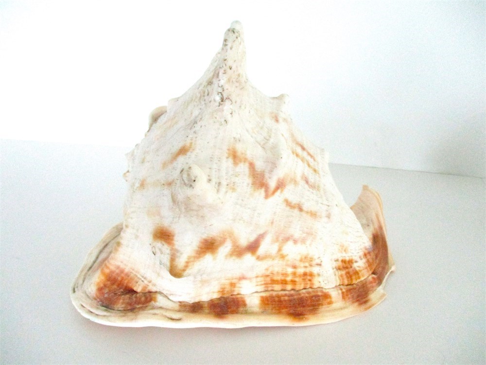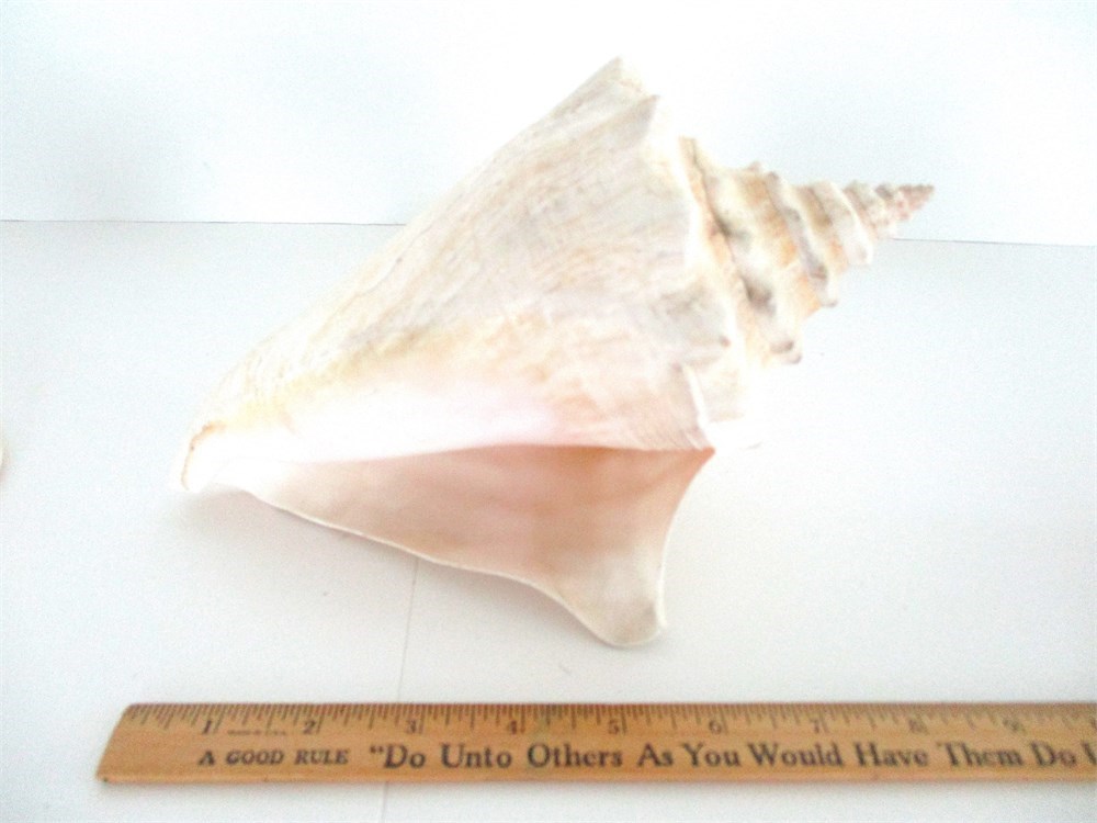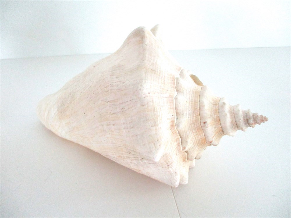 2. Queen Conch : Robust shell with elongated spire, grayish-white exterior with subtle striping and pink interior. Approx. 7 in. long. Caribbean Sea, Bahamas, Florida Keys