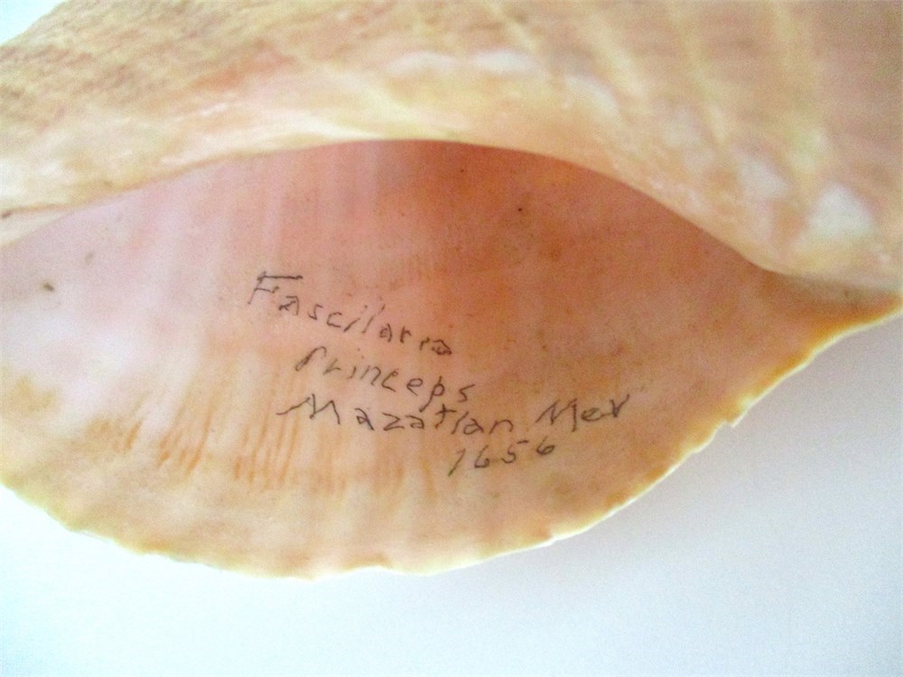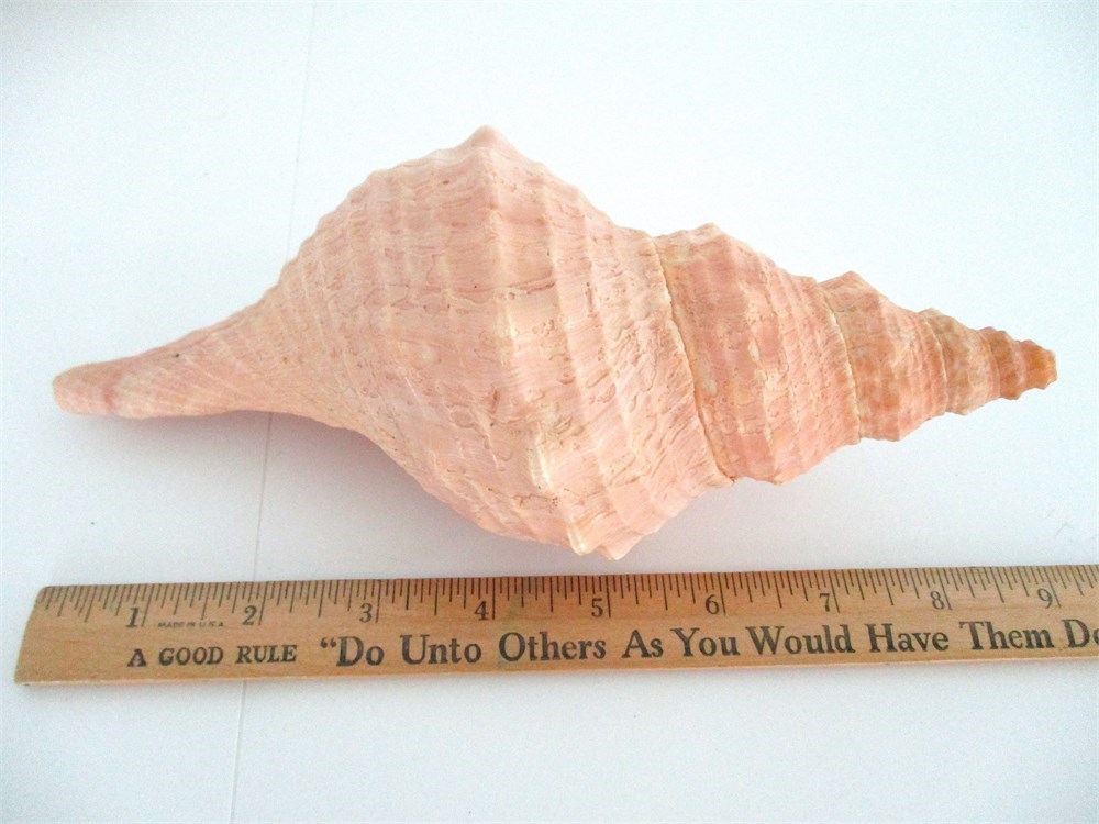 3. Horse Conch (Fascilaria Princeps) or related whelk type: Spiraled form with ribbed surface, warm salmon coloration. Approx. 8-9 in. long.