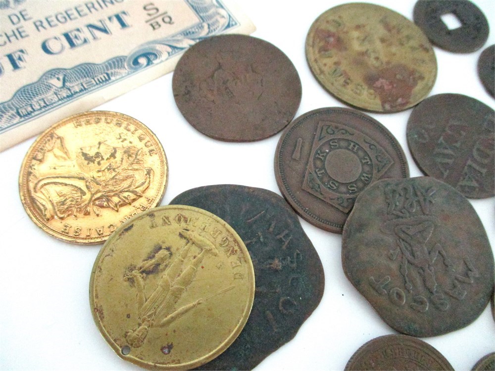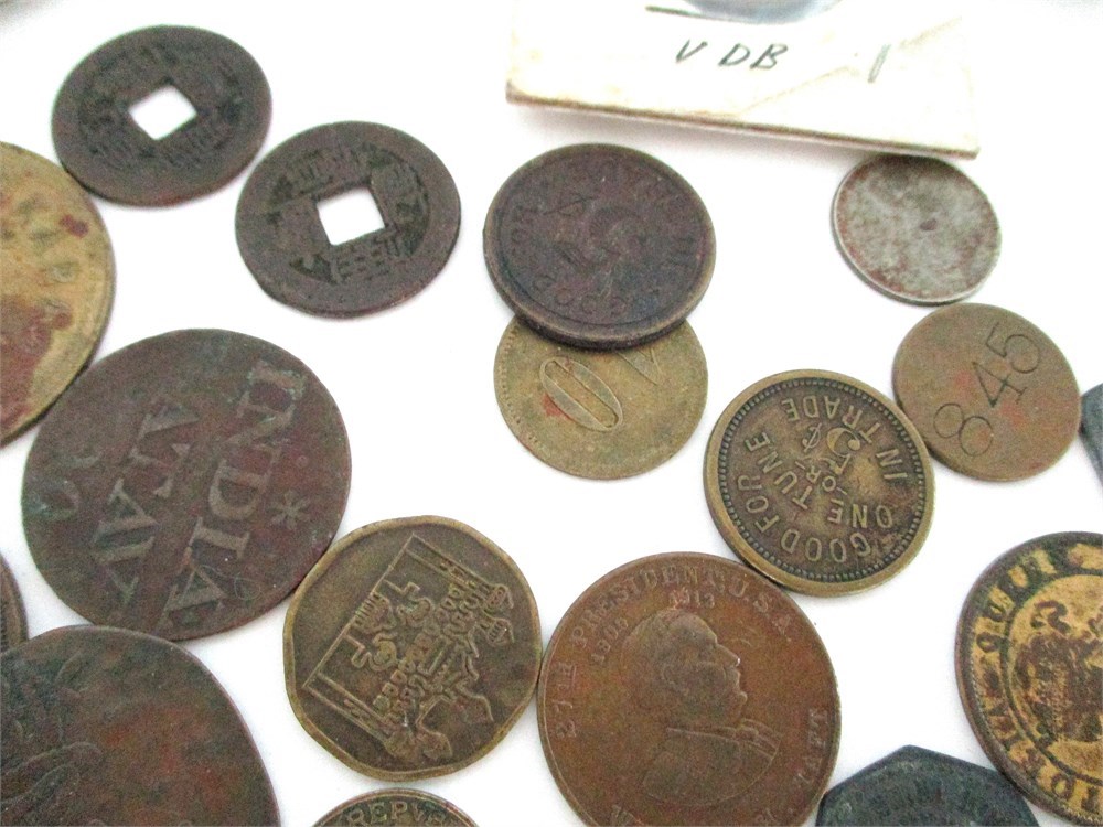 • World Coins: A mix of copper, bronze, brass, and silver-colored coins from various countries. Notable pieces include early Asian cash coins with square holes, mid-20th century circulated coins, and several larger copper trade-style tokens.