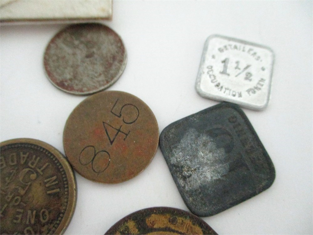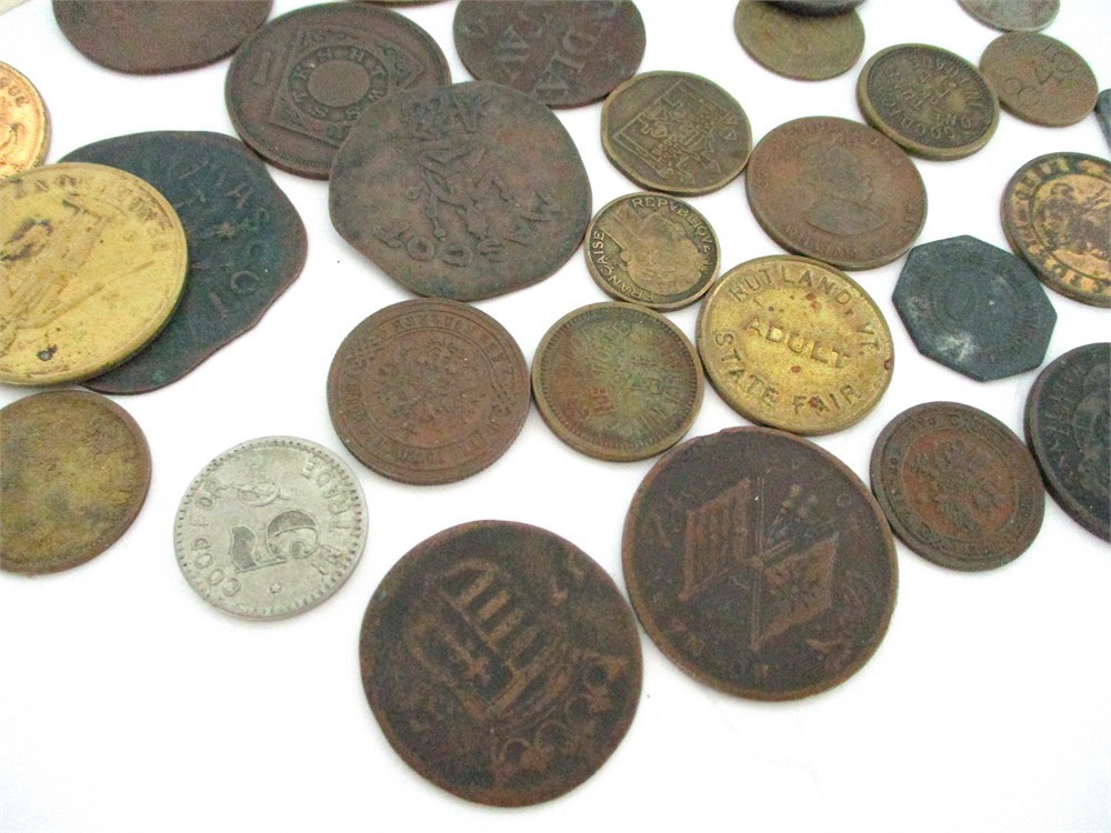 • Specialty Items: Wooden nickel token, a gold-tone commemorative medallion, and hexagonal tokens/coins.