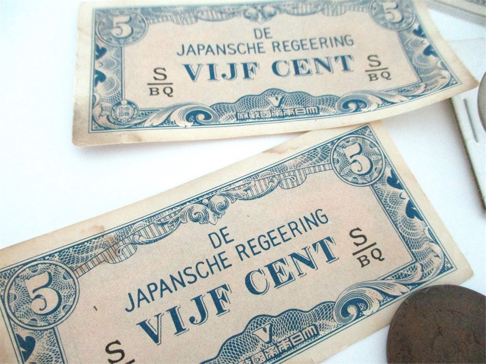 • Paper Currency: Two Japanese WWII-era occupation notes ("De Japansche Regeering – Vijf Cent").