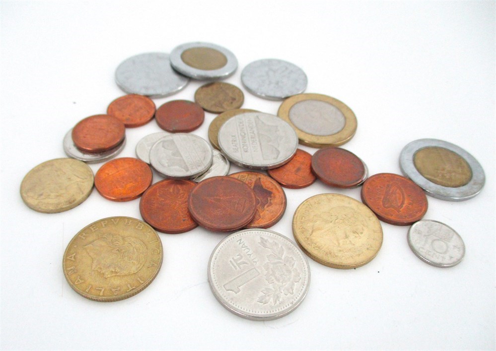 • Bimetallic Coins: A few larger two-tone coins, likely from Mexico and Europe (including 1 and 2 Euro types or predecessors).