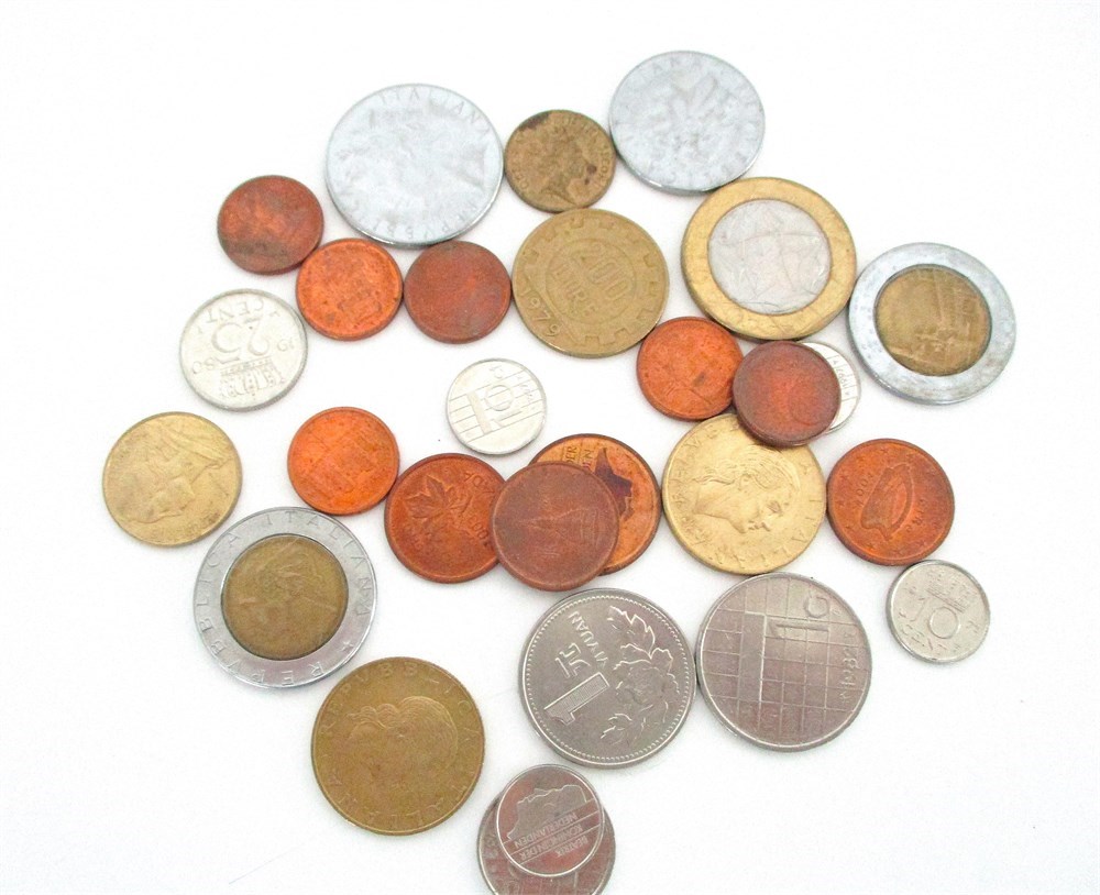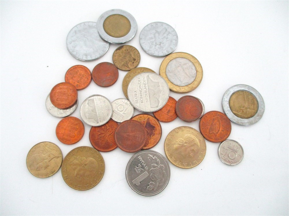 • European Coins: Several Netherlands coins (Koningin Beatrix issues), Italian coins (including 100 Lire and smaller denominations), and French coins.