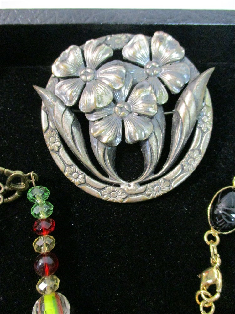 • A large silver-tone floral brooch depicting daffodils, possibly mid-century modern in design.