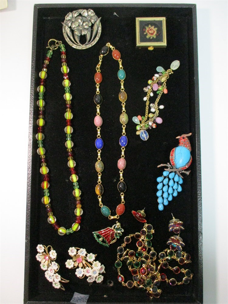 A charming assortment of vintage costume jewelry displayed on a black velvet tray, featuring an eclectic mix of colorful and whimsical pieces. Highlights include: