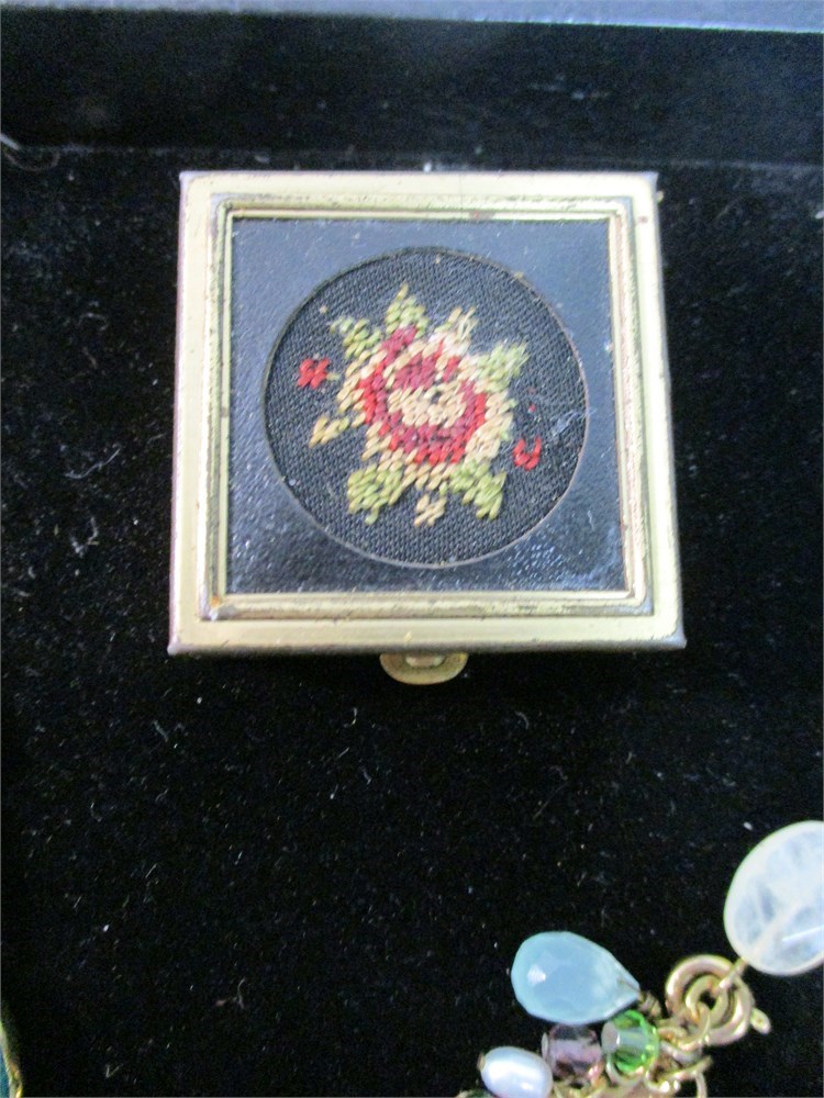 • A mosaic-style compact with floral motif on a black enamel background.