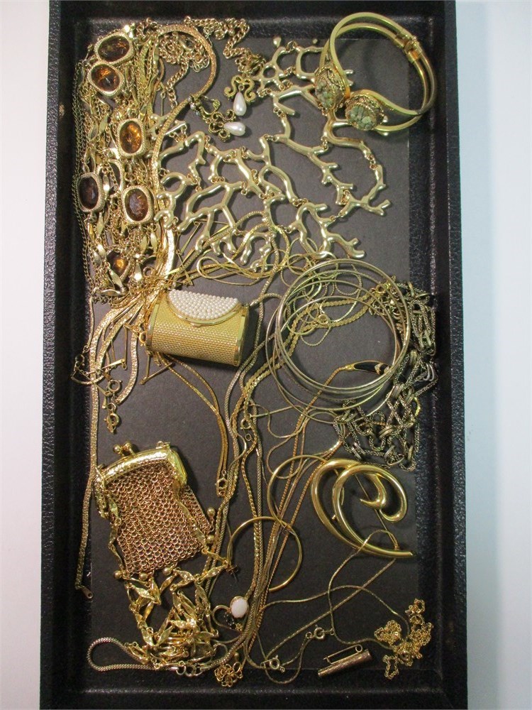 A striking assortment of gold-tone costume jewelry presented in a black display tray. This lot features a variety of classic and statement pieces including: