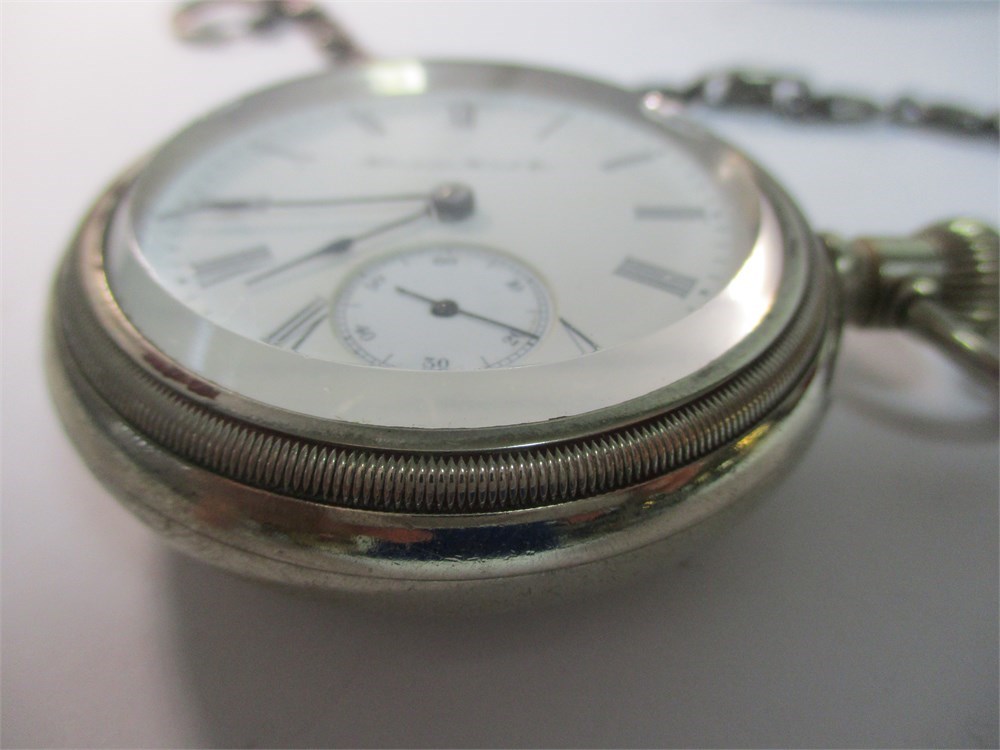 A fine example of an antique Hampden Watch Co. pocket watch, complete with matching silver-tone chain. The watch features a clean white enamel dial with Roman numerals, blued-steel hands, and a subsidiary seconds dial at the 6 o’clock position. The dial is signed Hampden Watch Co., reflecting the craftsmanship of this historic American manufacturer active in the late 19th and early 20th centuries.