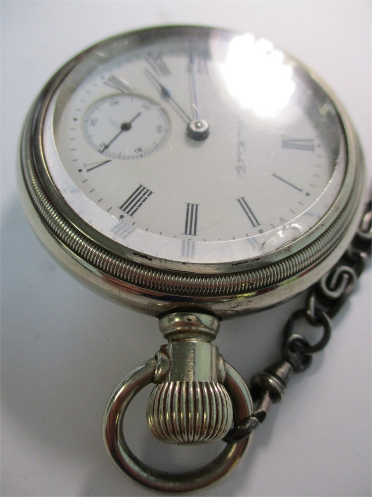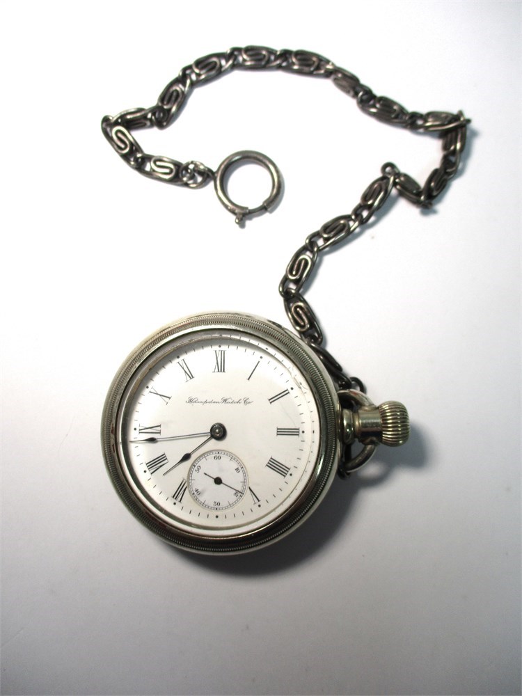Antique Hampden Watch Co. Pocket Watch with Chain – Roman Numeral Dial, Silver-Tone Case