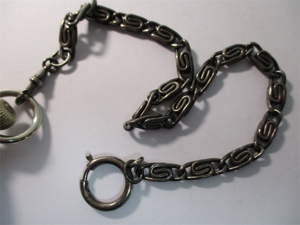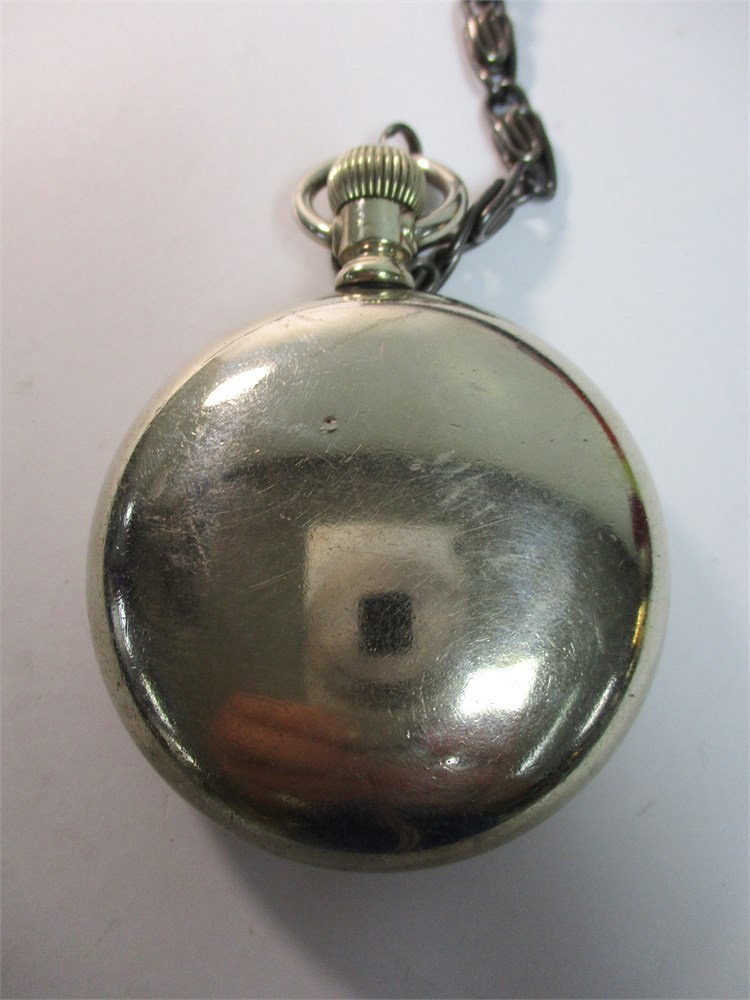 Silver-tone metal case, enamel dial, blued-steel hands, base metal chain.