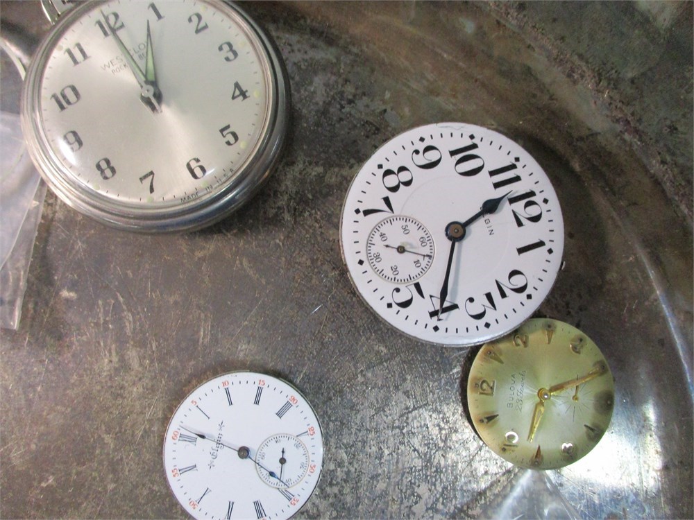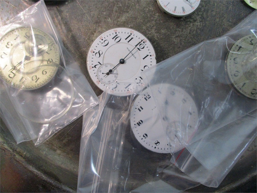 • Several vintage pocket watch dials, most with Arabic or Roman numerals, some signed by makers including Hampden Watch Co. and other early American brands.