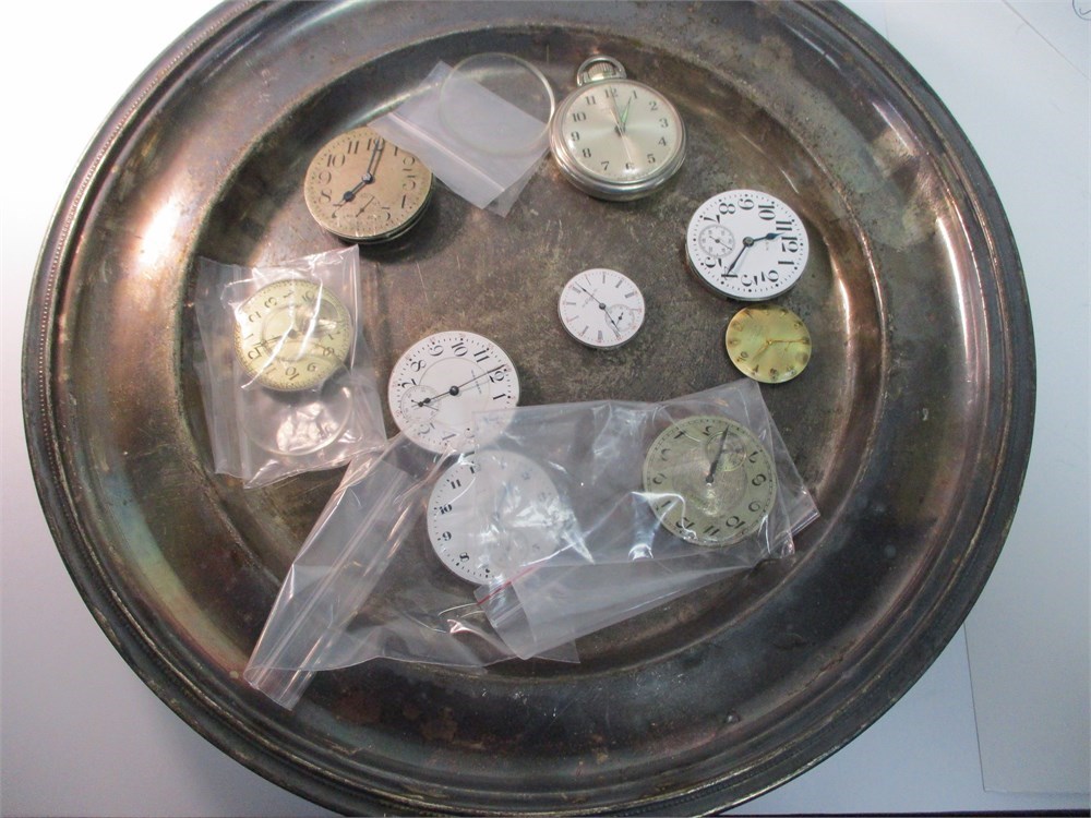 A collection of assorted vintage watch components displayed on a silver-tone tray, including multiple pocket watch and wristwatch movements and dials. The lot features:  ***Tray not included**