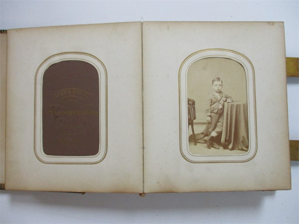 This small Antique Leather Photo Album contains Tin Types and CVDs.  The album has brass hinged closures.  The leather has pulled away from the spine.  Total of 40 photos. it measures 5.25 x 6 x 3".