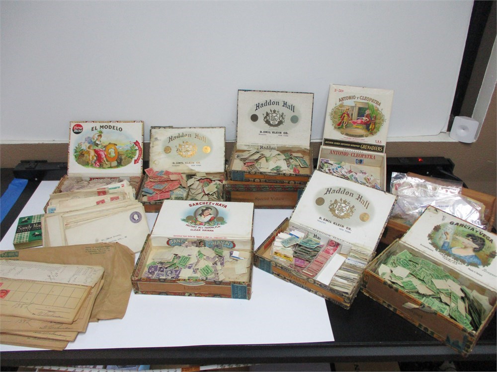 A Large and Wonderful Lot of Stamps from all over the world and they are all in Vintage Cigar Boxes along with some ephemera.