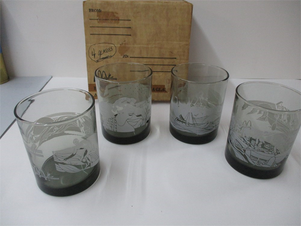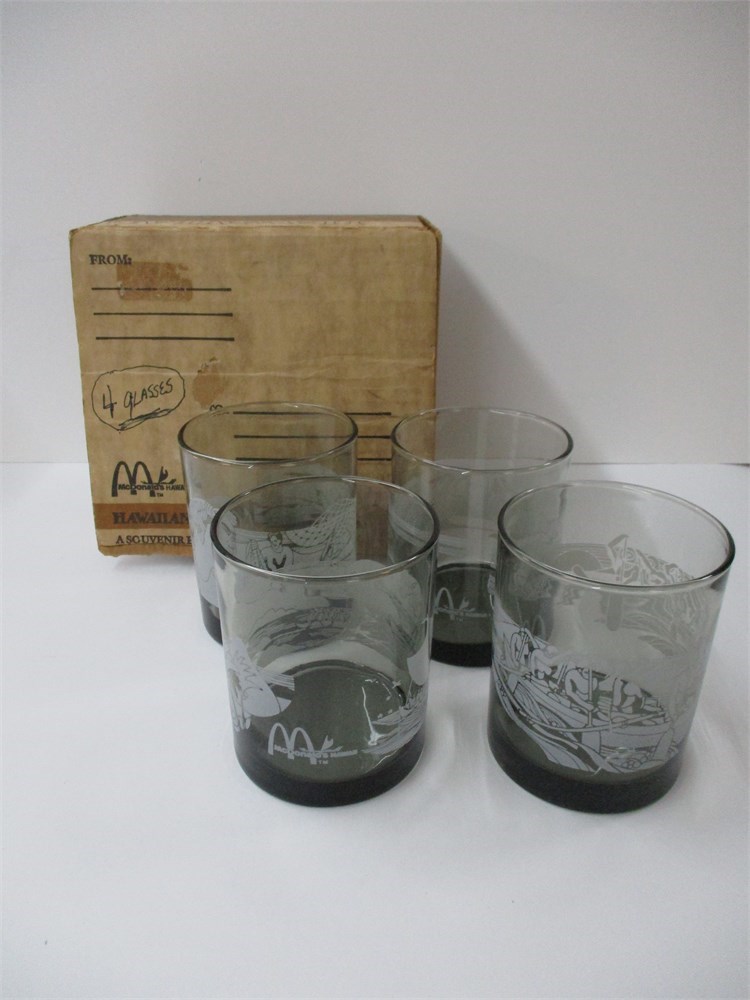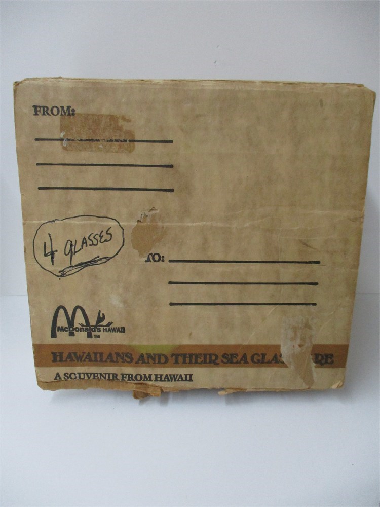 Very nice McDonald's souvenir collection of Hawaiian and Sea Glass tumblers.  They stand 4" tall and each tumbler displays a different Hawaiian theme.  They are in great condition and they are in the original box.  The box shows some wear.