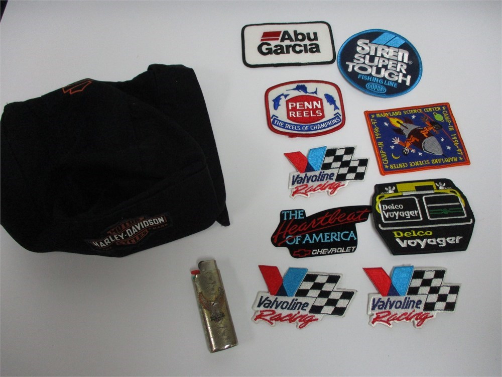 An assortment of various car badges for jackets along with a Harley Hat and Lighter.  Unsure of working condition of the Lighter.  All in very nice condition.