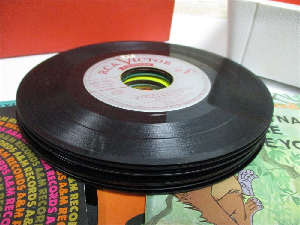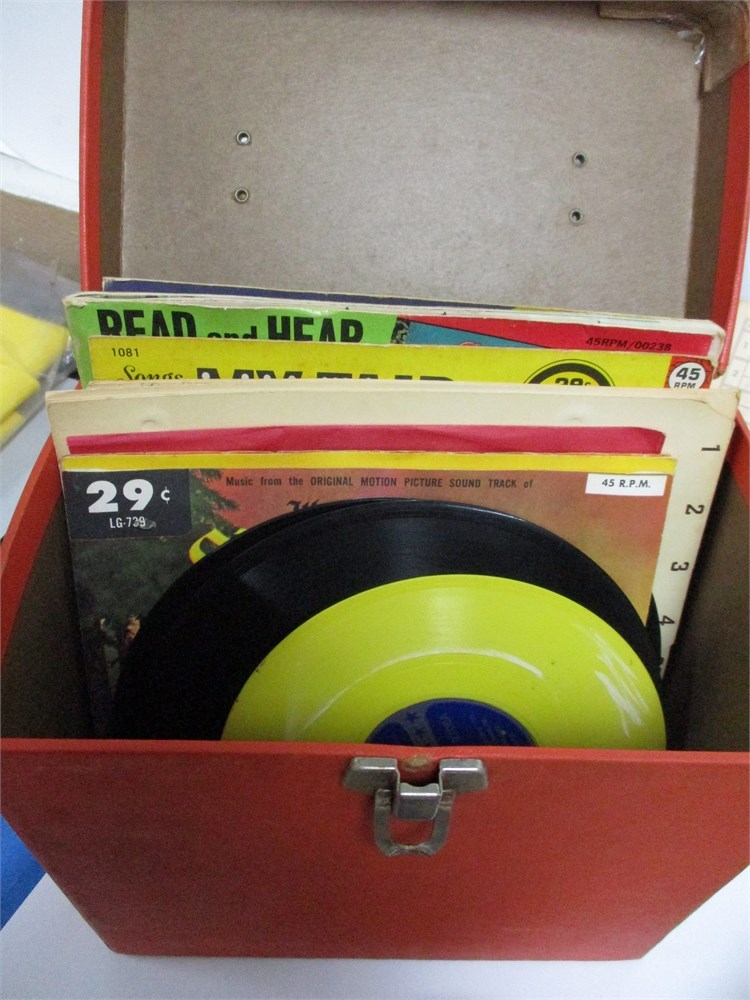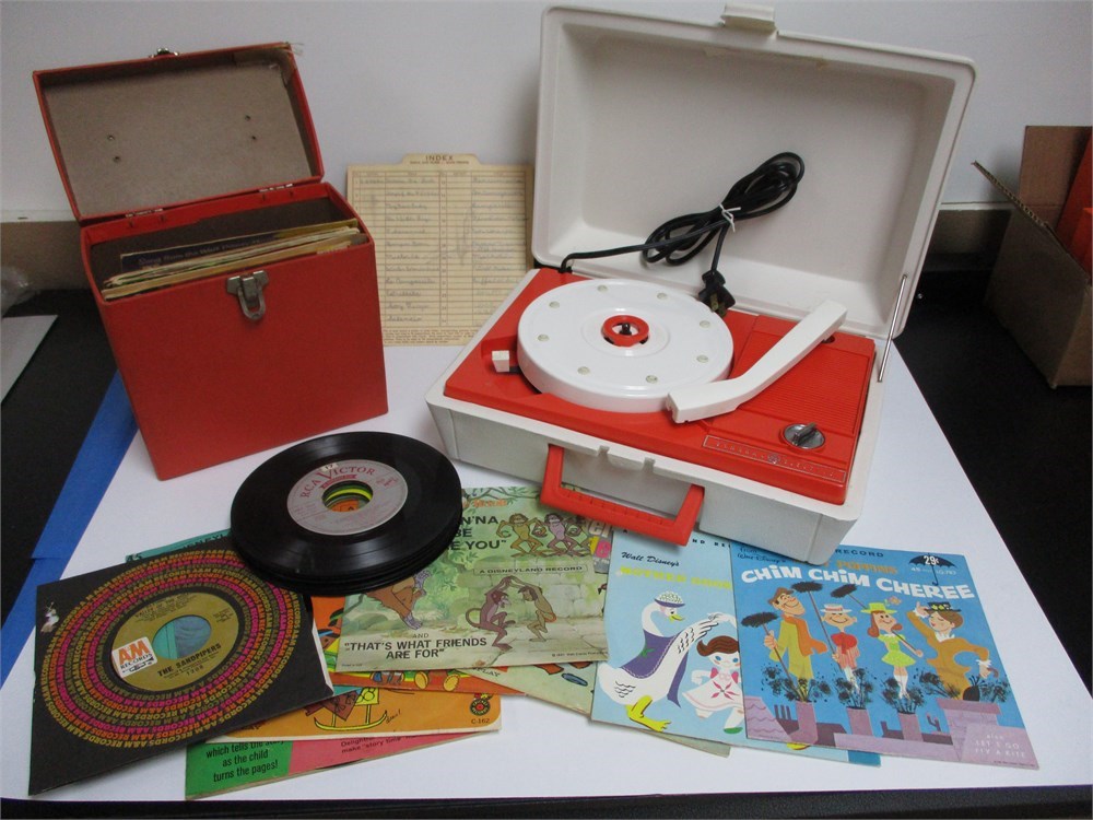 • Style: Mid-century portable phonograph and children’s vinyl record collection