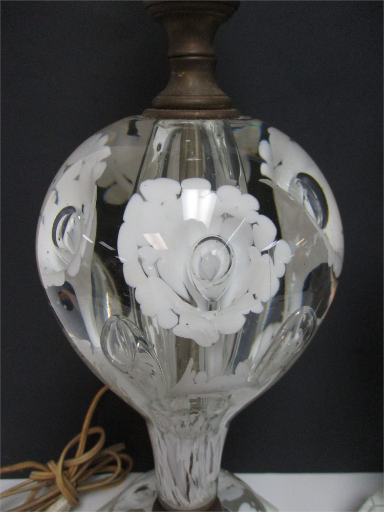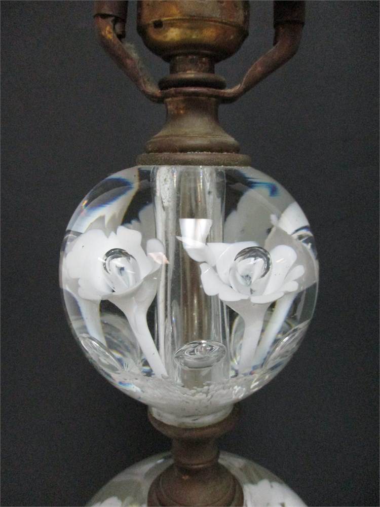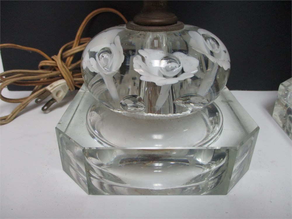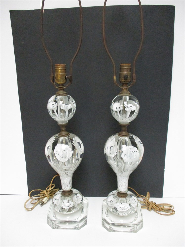 This is STUNNING pair of Extra Large, 3 Tier, St. Clair Table Lamps standing 31" tall x 5.25" across at its widest.  Beveled paperweight art glass base.  Each clear glass tier has white trumpet flowers and each tier is separated with brass hardware.  There is no shade or finial and each lamp weighs 13 pounds.  An impressive pair of lamps and certainly statement pieces. HAPPY BIDDING !!