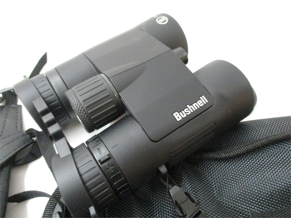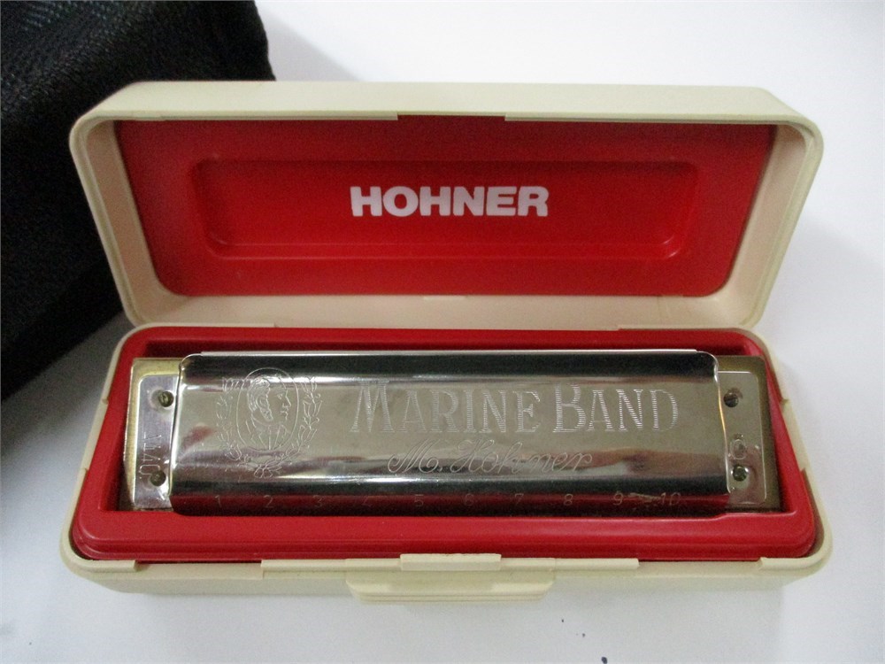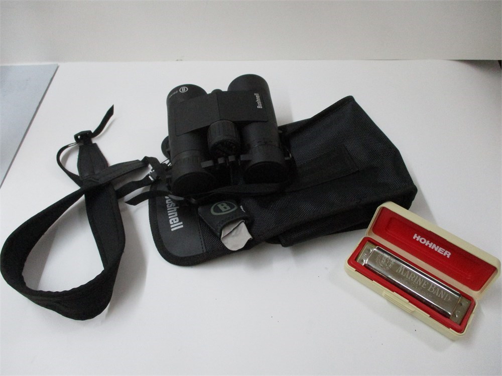 A  2 piece lot consisting of a pair of Bushnell Binoculars 10x42 with carrying case and a wonderful Hohner Marine Band Harmonica in original case.   All in very nice condition.