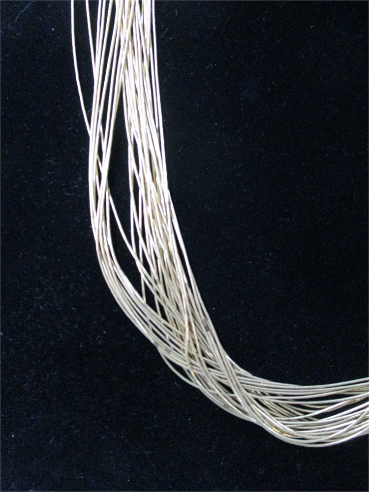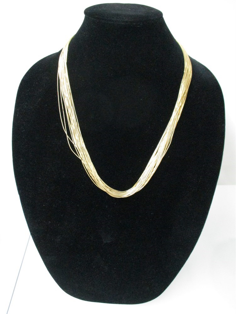 Stylish multi-strand 12K Gold Filled necklace composed of numerous fine, flexible wire strands that create a shimmering, layered effect. The lightweight design gives the piece a modern, elegant look, suitable for both formal and casual wear. The strands are 12K Gold Filled, finished with a simple clasp for easy wear. This type of necklace is popular for its versatility — it can be worn as a statement piece or layered with other jewelry.