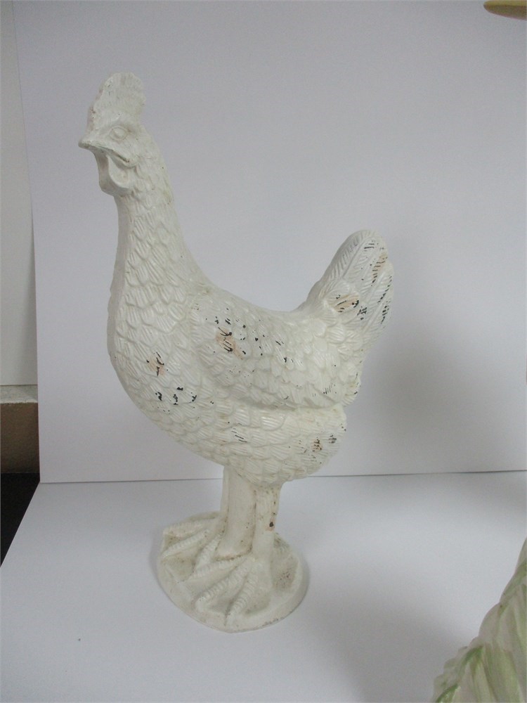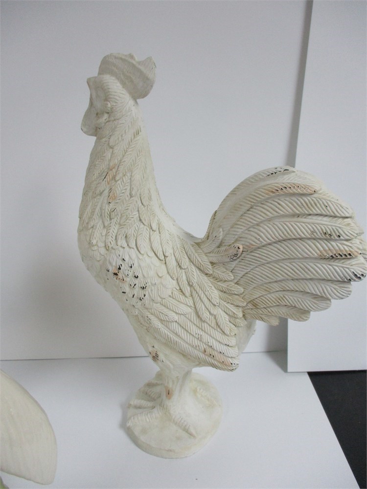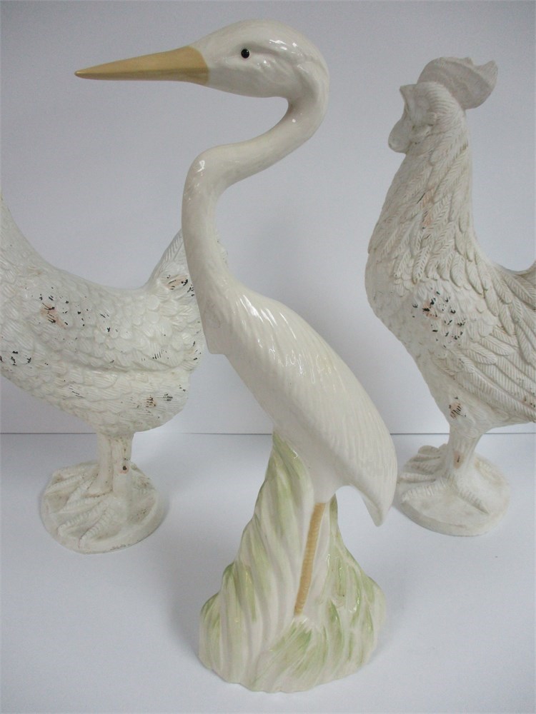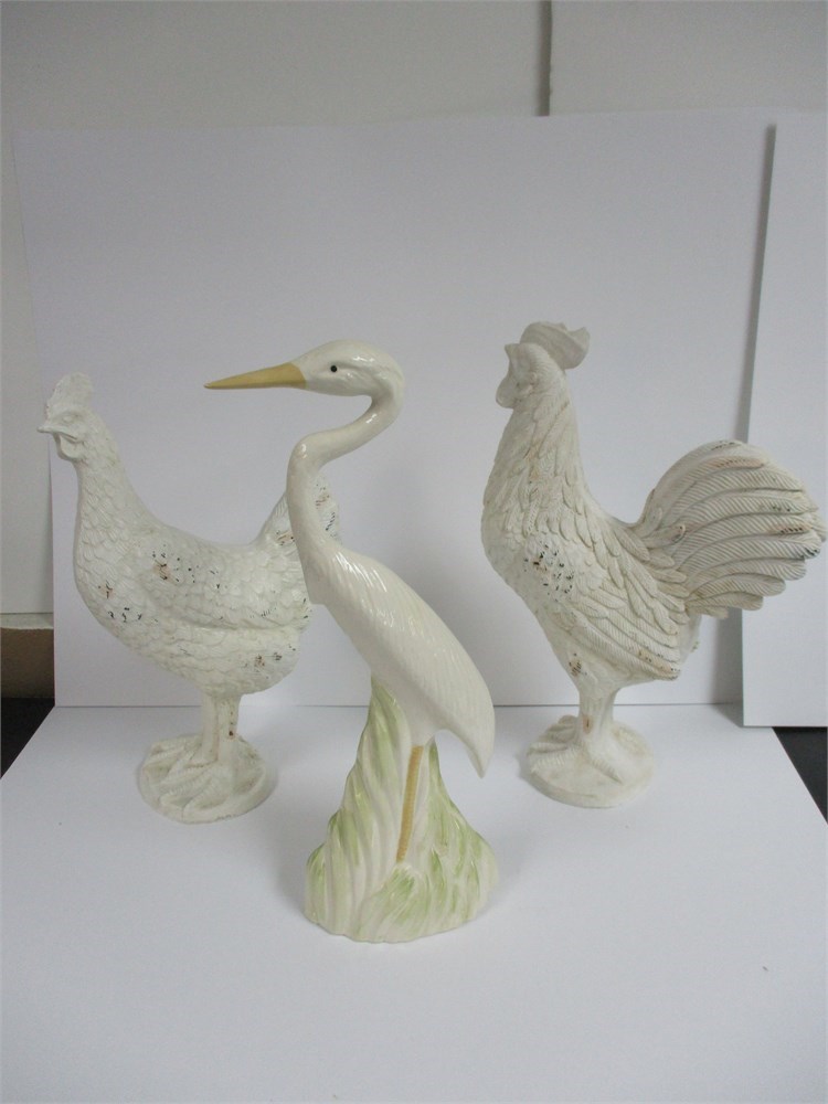 This is a 3 Piece Bird Lot consisting of 2 Resin Roosters and a Ceramic Ibis.  All in good condition and nicely detailed. Largest Bird is 16" tall.