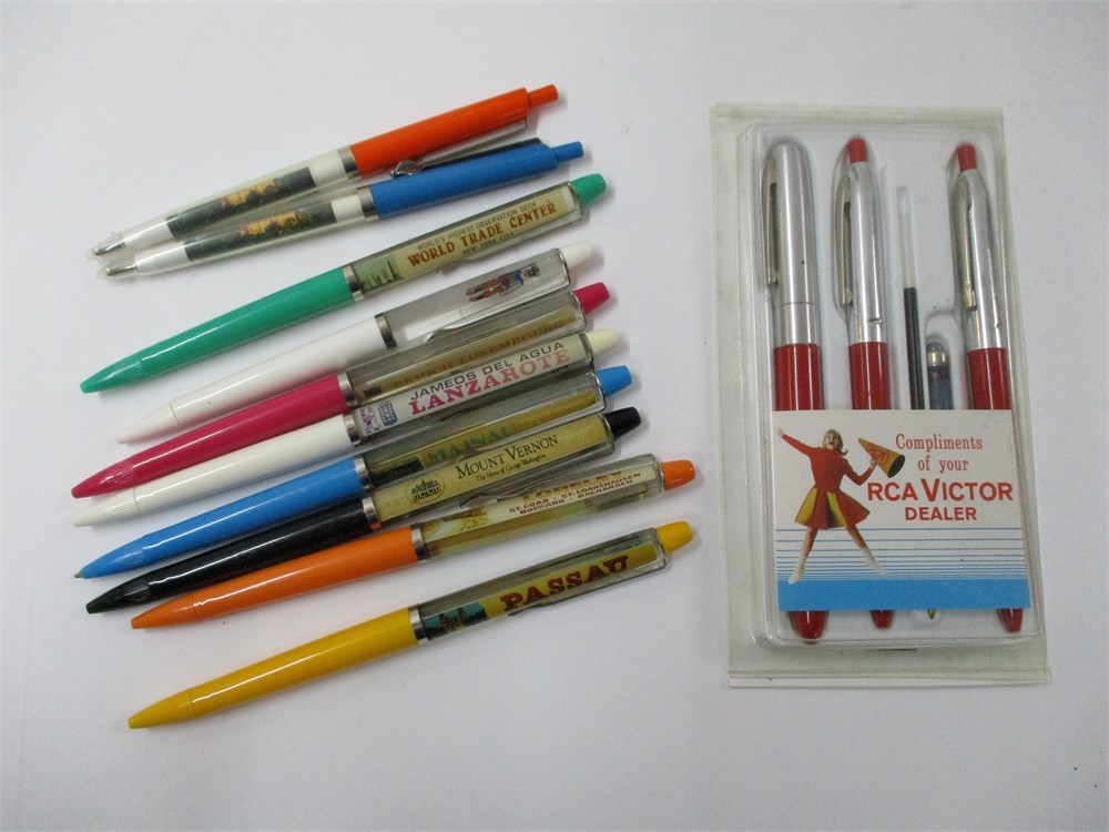 A Vintage lot of 11 Pens, including 8 Floating Action Souvenir Pens; Mainau, Danmark, Loreley, Passau, Mount Vernon, Lanzarole, Luxembourg, 2 non floating and a complimentary sealed pack from RCA Victor.