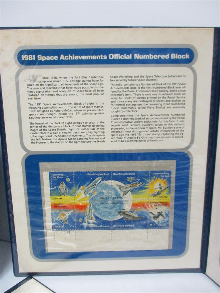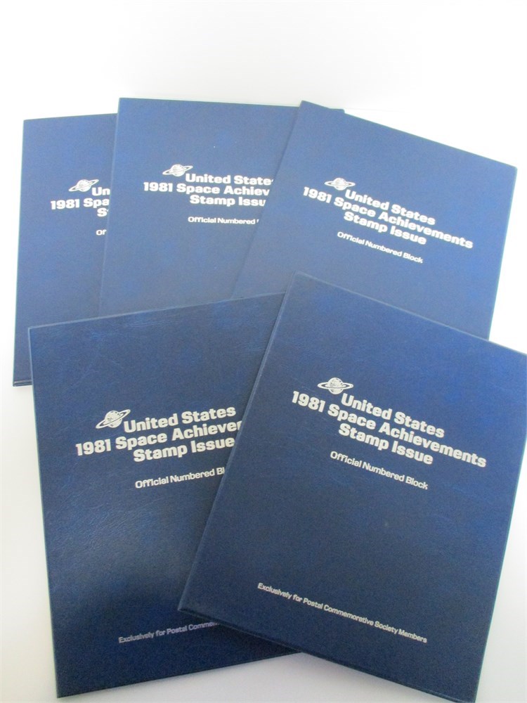 This vintage lot consists of  5 Booklets of  U.S. 1981 Space Achievements Stamp Issue Official Numbered Block.  Was exclusively for Postal Commemorative Society Members.  They are in perfect vintage condition.