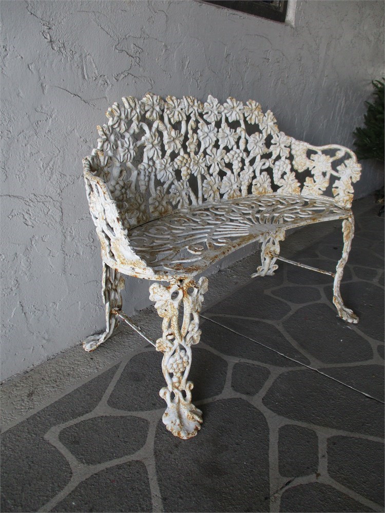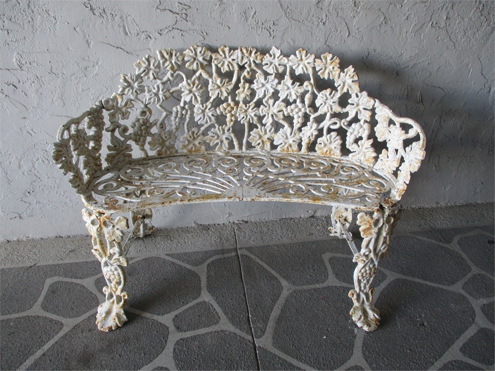 Charming cast iron garden bench in a classic Victorian style, featuring an intricate openwork design of grape clusters, leaves, and vines across the back, seat, and legs. Finished in aged white paint with natural weathering and patina, giving it desirable vintage character. The curved seat and detailed casting reflect the ornate craftsmanship typical of 19th- and early 20th-century revival garden furnishings.
