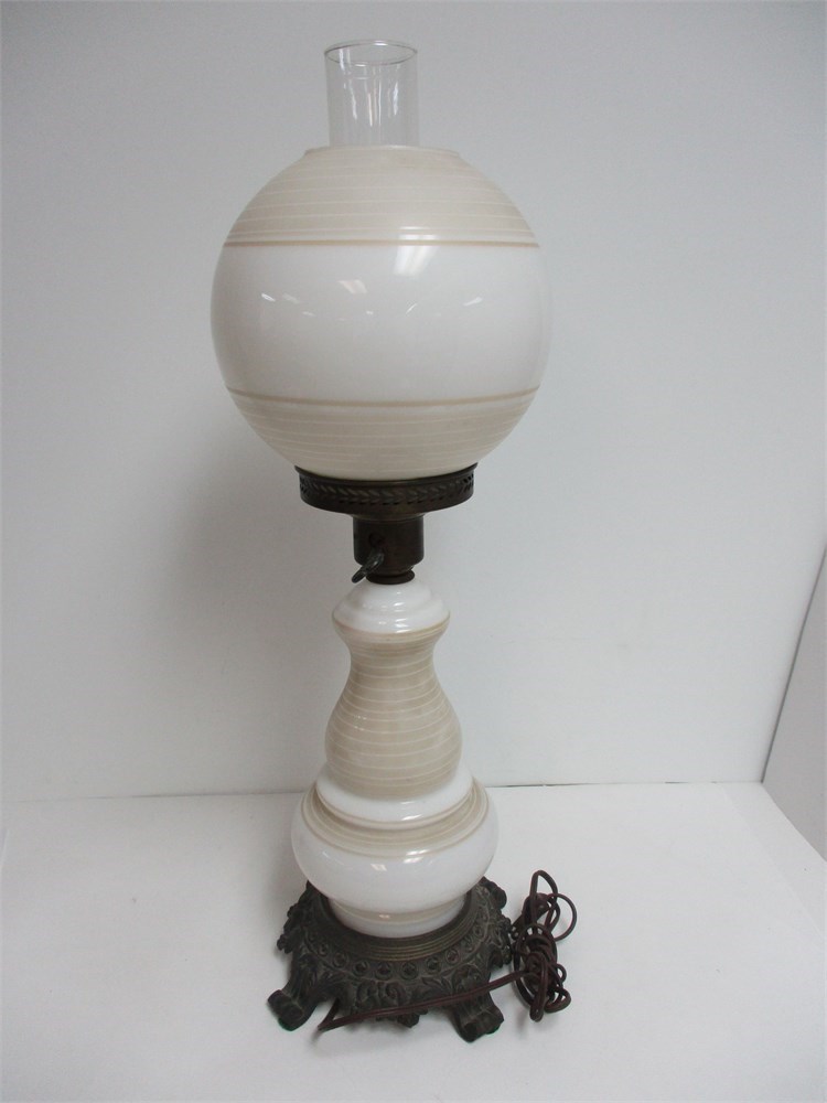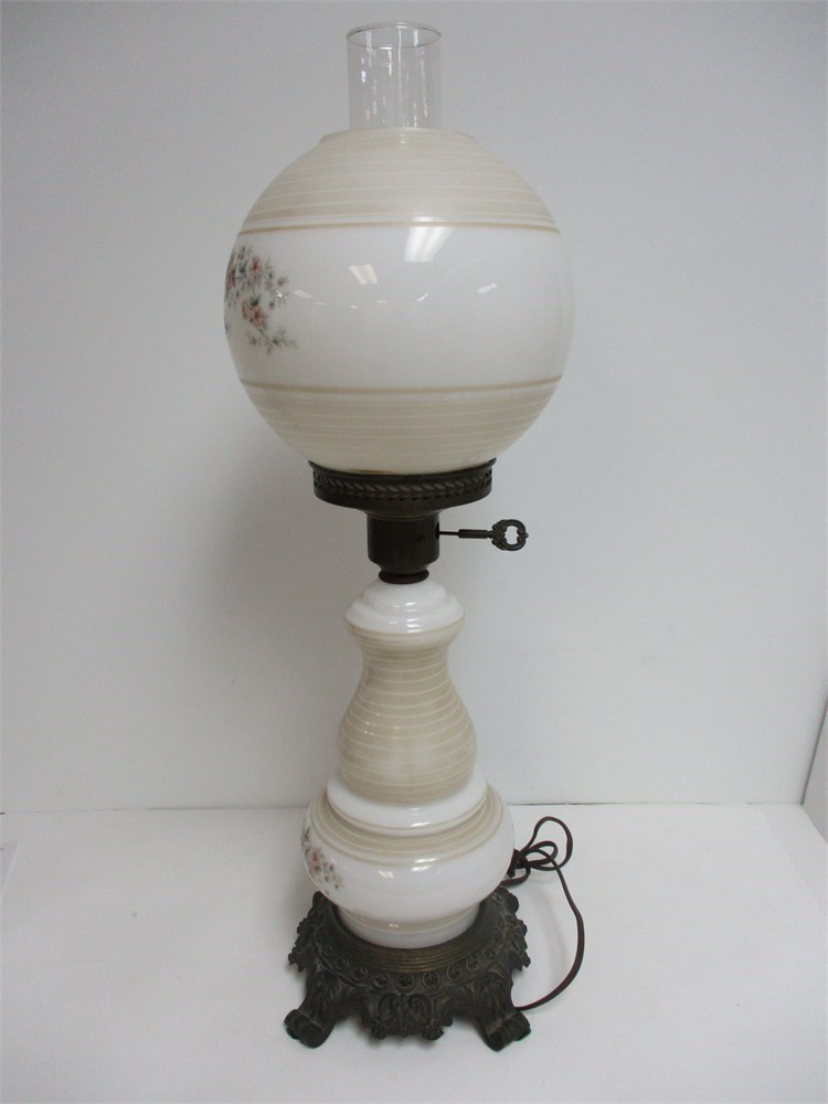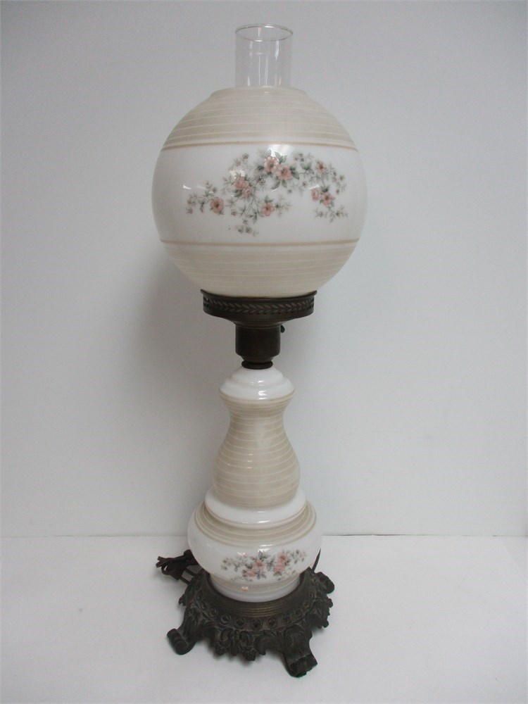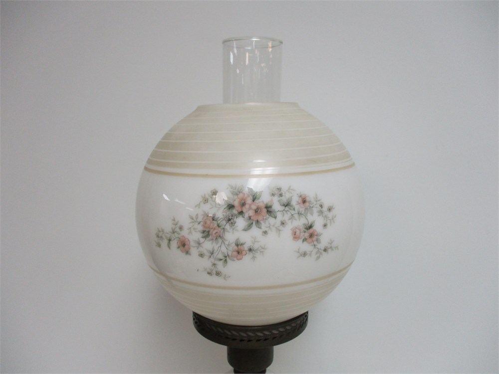Beautiful vintage electric Hurricane Lamp with hand painted floral detail.  Brass base, collar and key. You can light the top, bottom or both.  Very nice vintage condition with some minor paint loss.  Stands 23 1/2" tall. It works !  Even prettier in person !