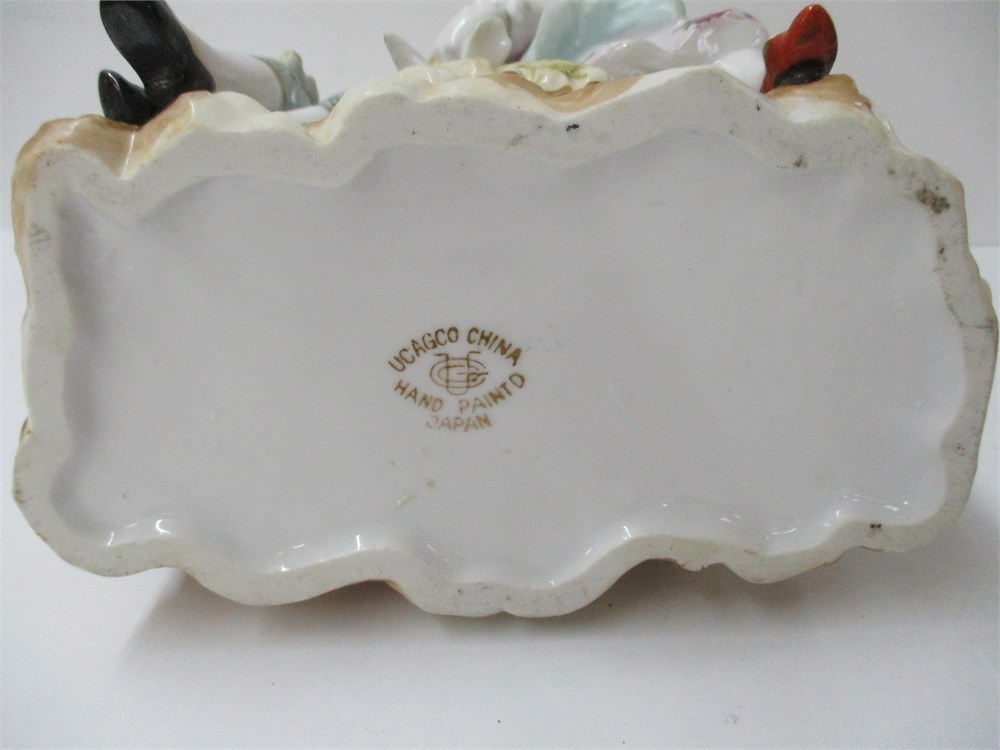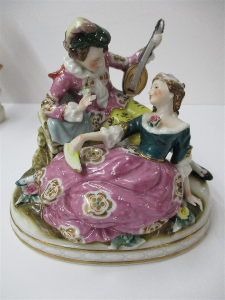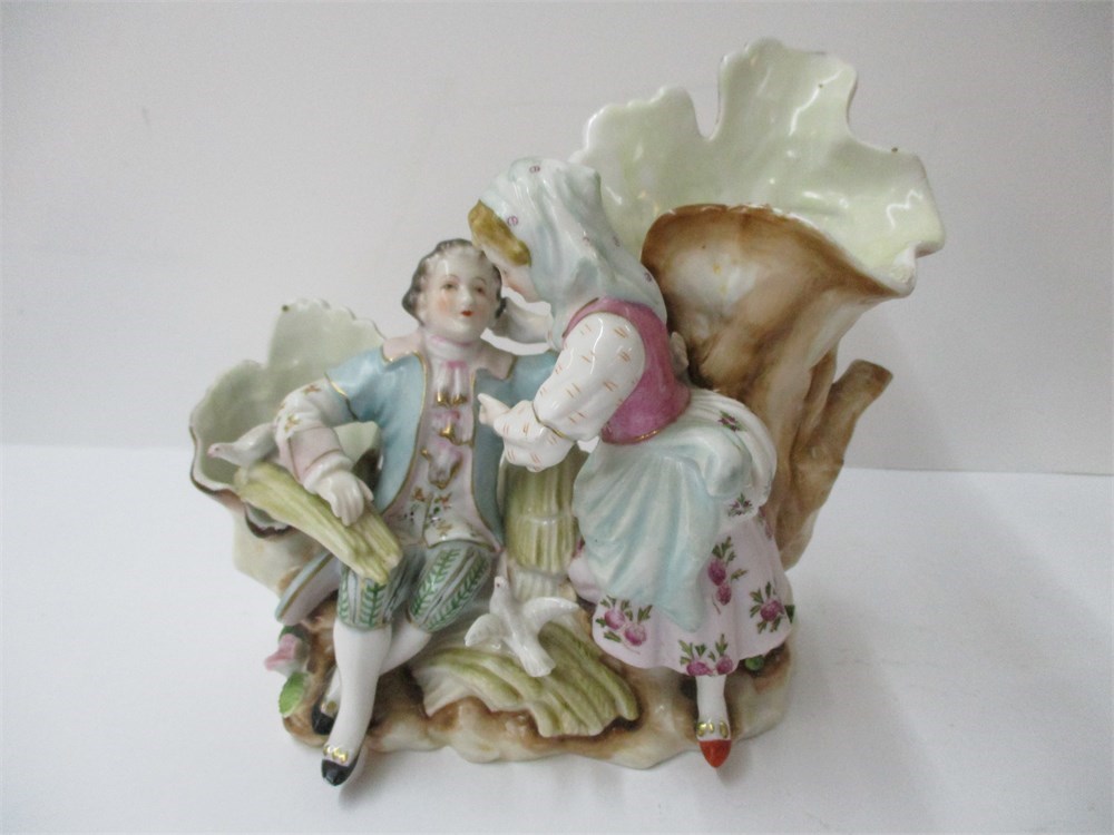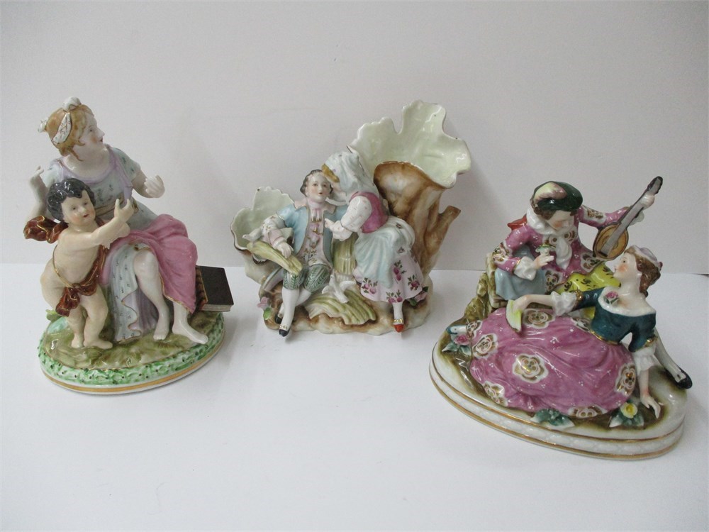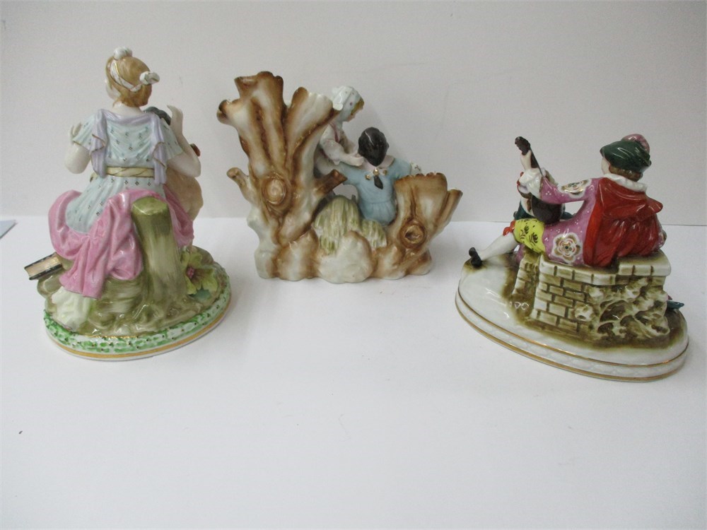 A wonderful Lot of 3 Sevres-style figurines.  The one on the left is a Edme' Samson-Sevres style piece, signed and marked Occupied Japan.  The middle piece is a Dresden porcelain, Victorian scene courting couple, Occupied Japan.  The one on the right is a Double Flower Vase, Colonial Couple, made in Japan.  All three are in very nice vintage condition, wonderful colors and a lovely grouping.  The tallest is 7".