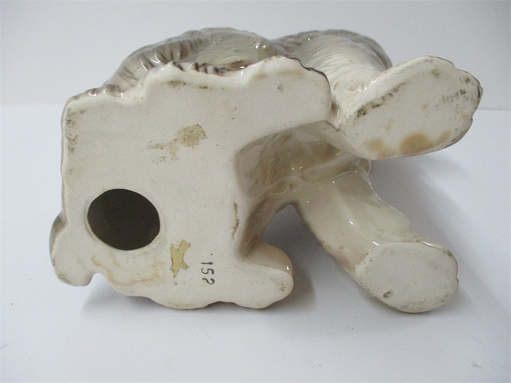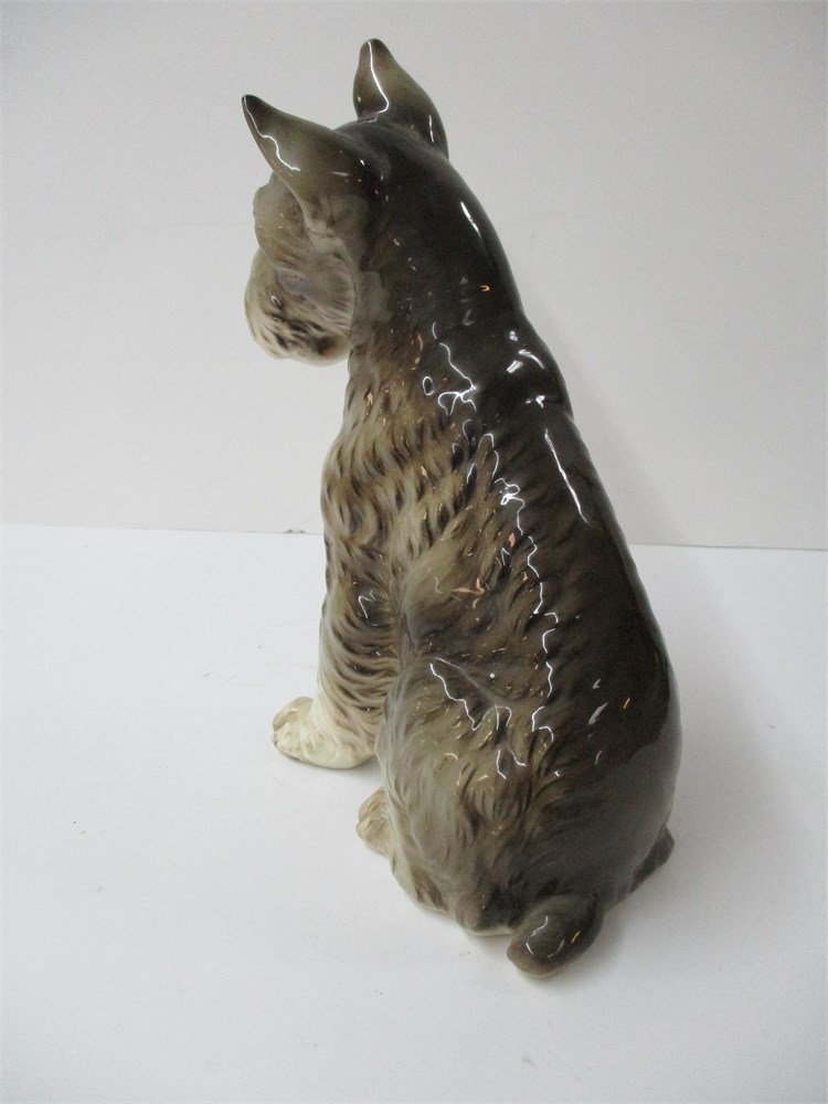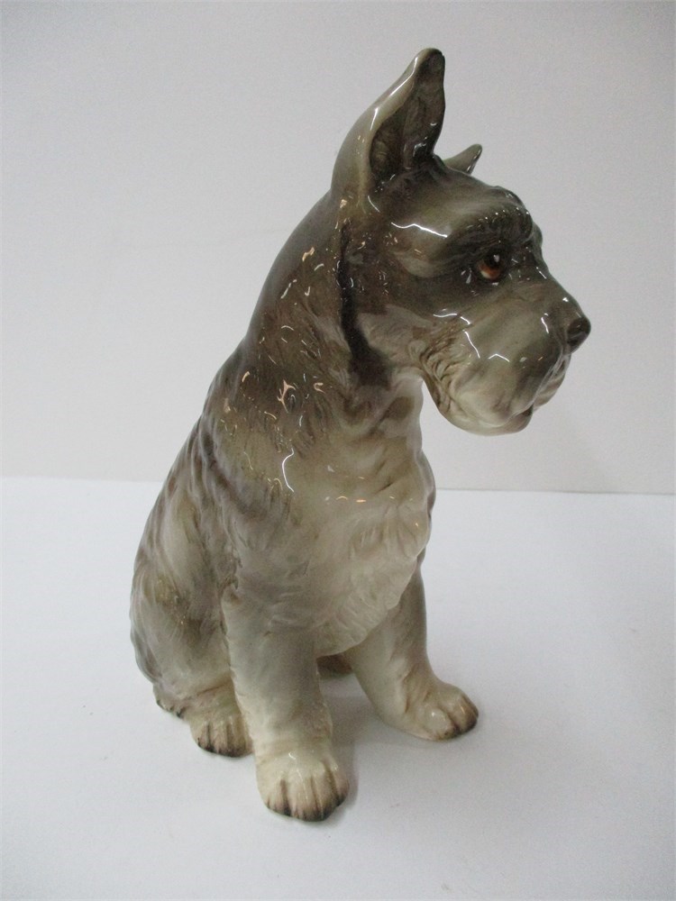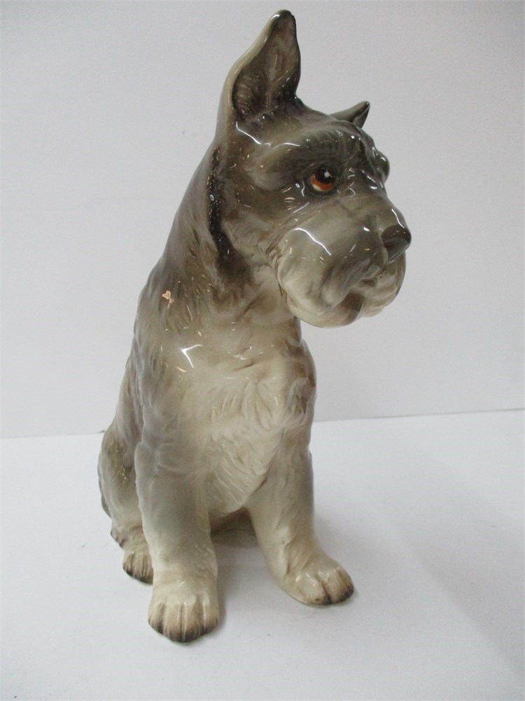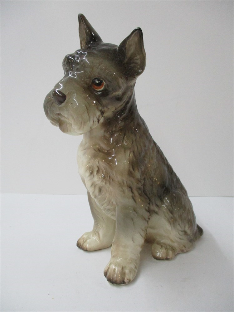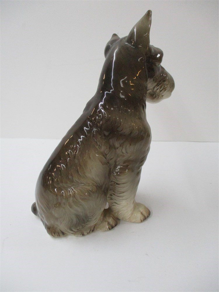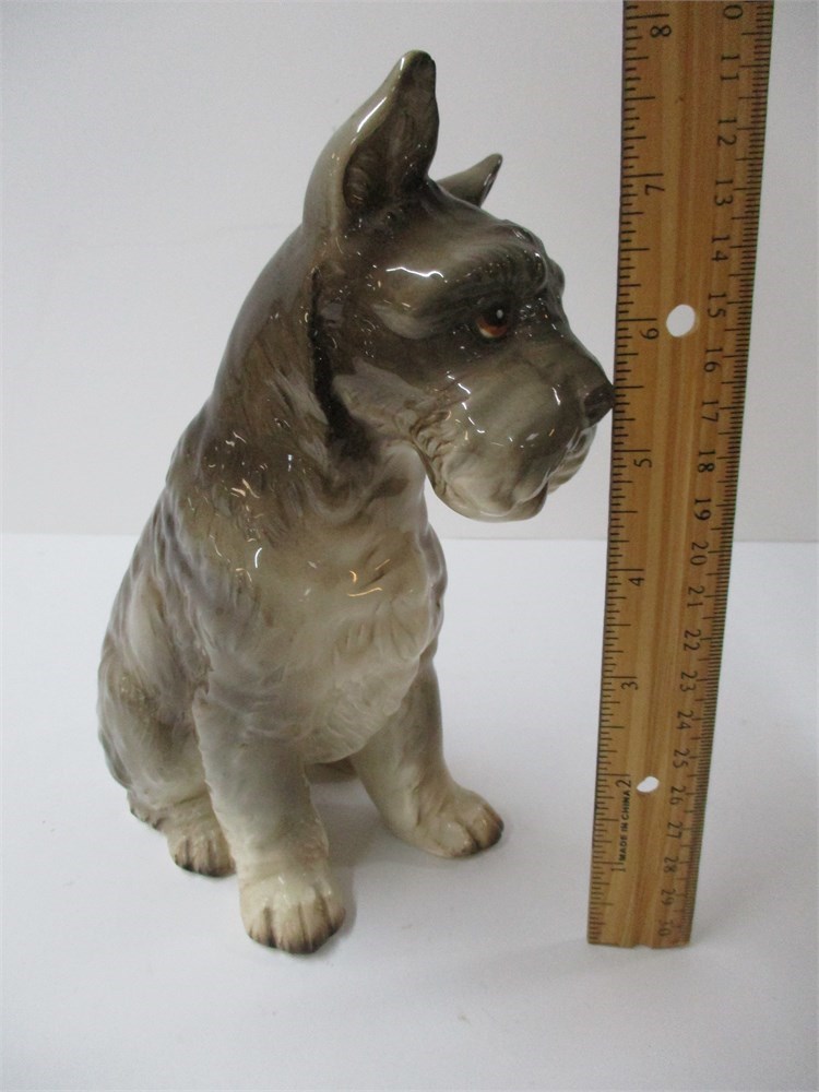 This is an adorable Schnauzer figurine.  I believe this was made by the Shafford Pottery Co., Japan.  They exported pieces to the U.S. from Japan starting in the 1940's and ending in the 1970's.  They made and extensive line of animal figurines such as this 8" porcelain dog.  Very realistic, high gloss finish.  The label is missing from the bottom but it is numbered 152.  It is in wonderful vintage condition  with no chips, cracks or crazing.