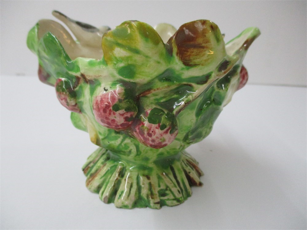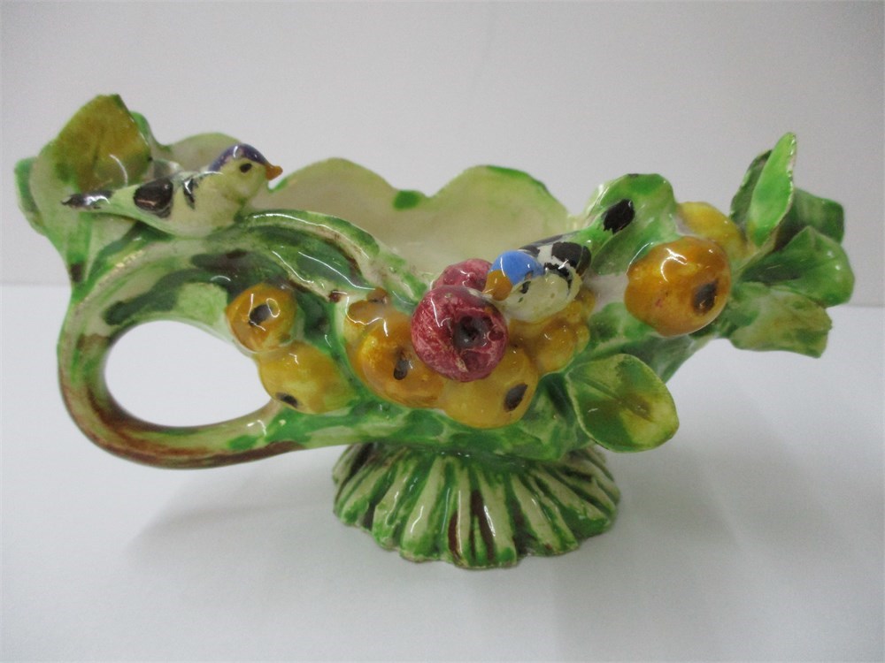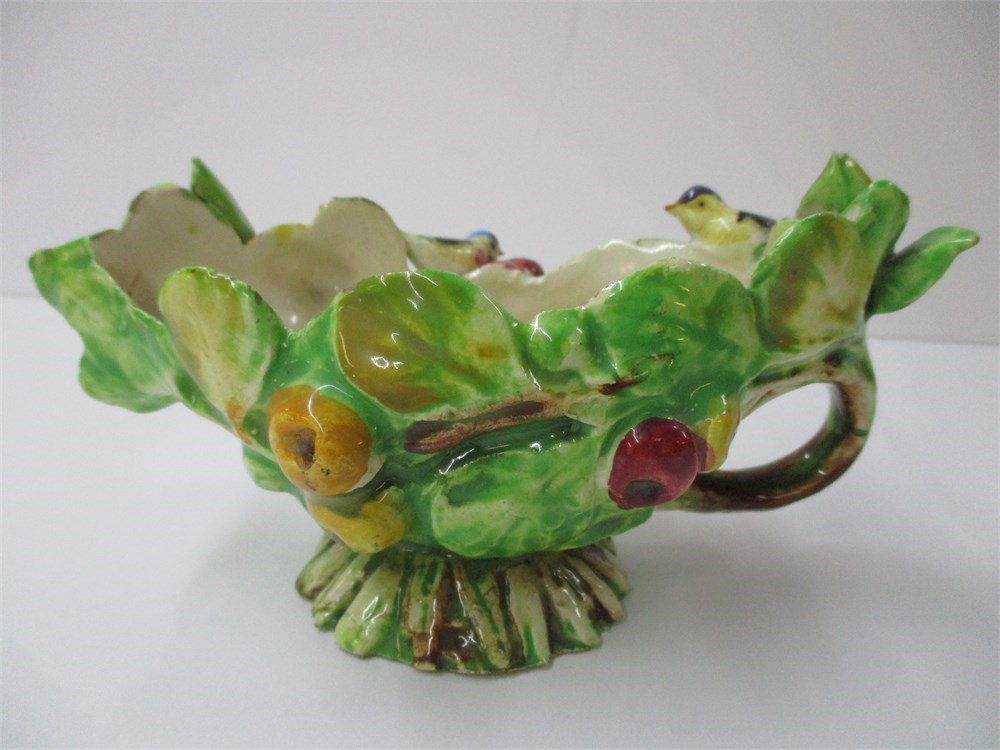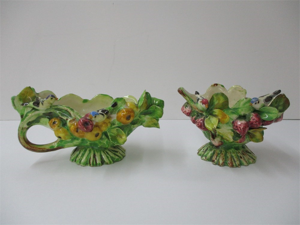 Vintage Majolica pieces with birds, leaves and berries, possibly a creamer & sugar?  In very good vintage condition. Larger piece measures 6 x 3 x 2.5" and the smaller 4.5 x 3 x 3".