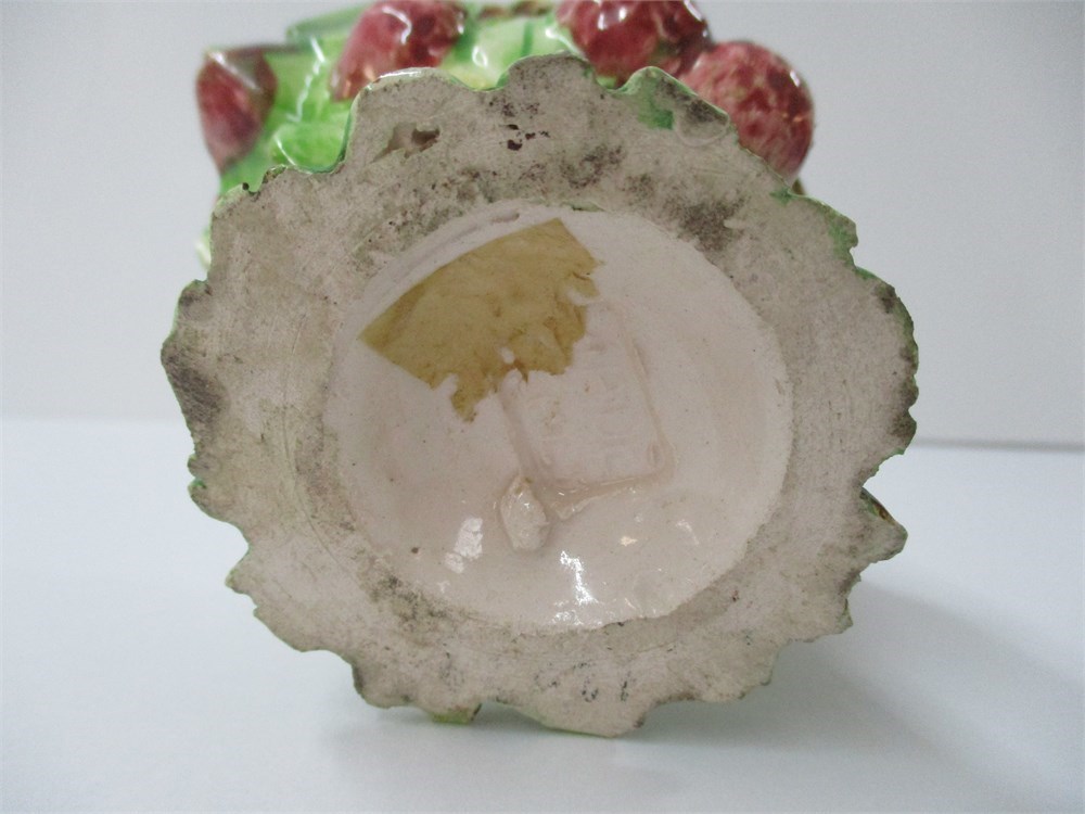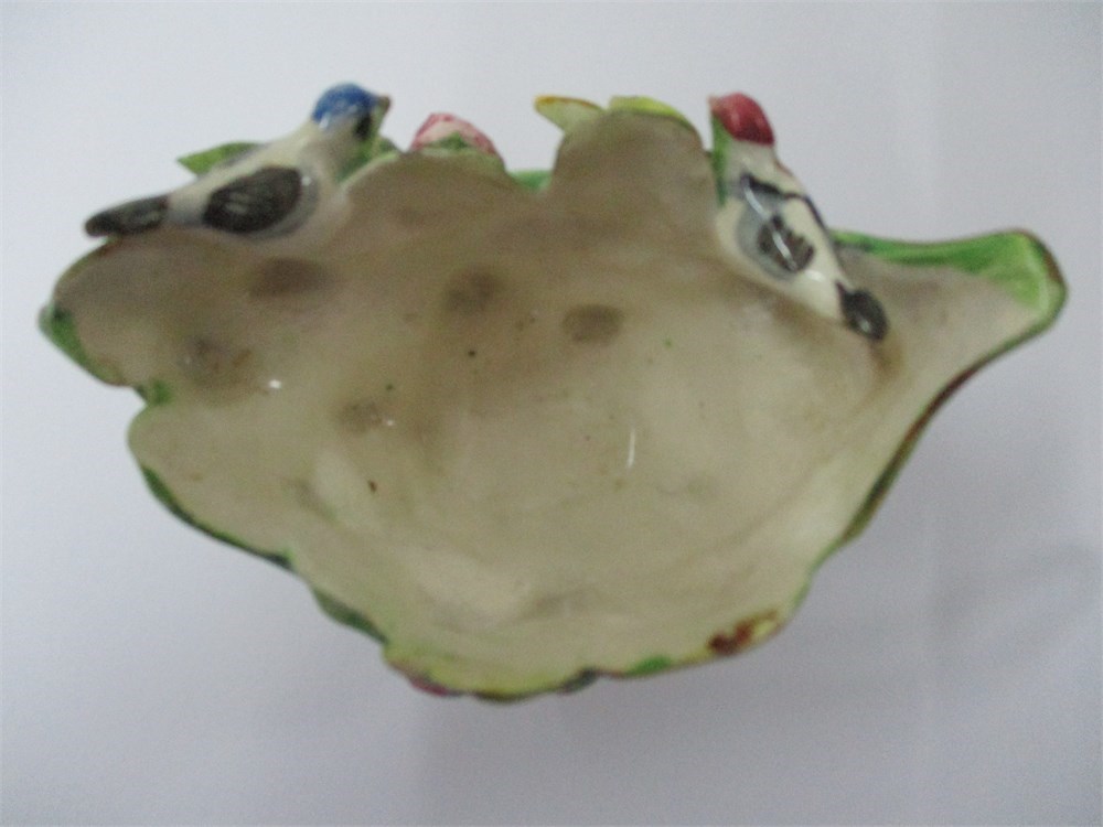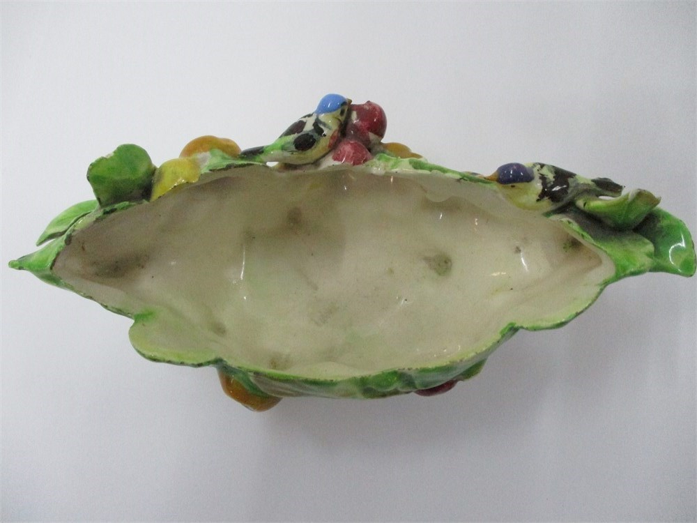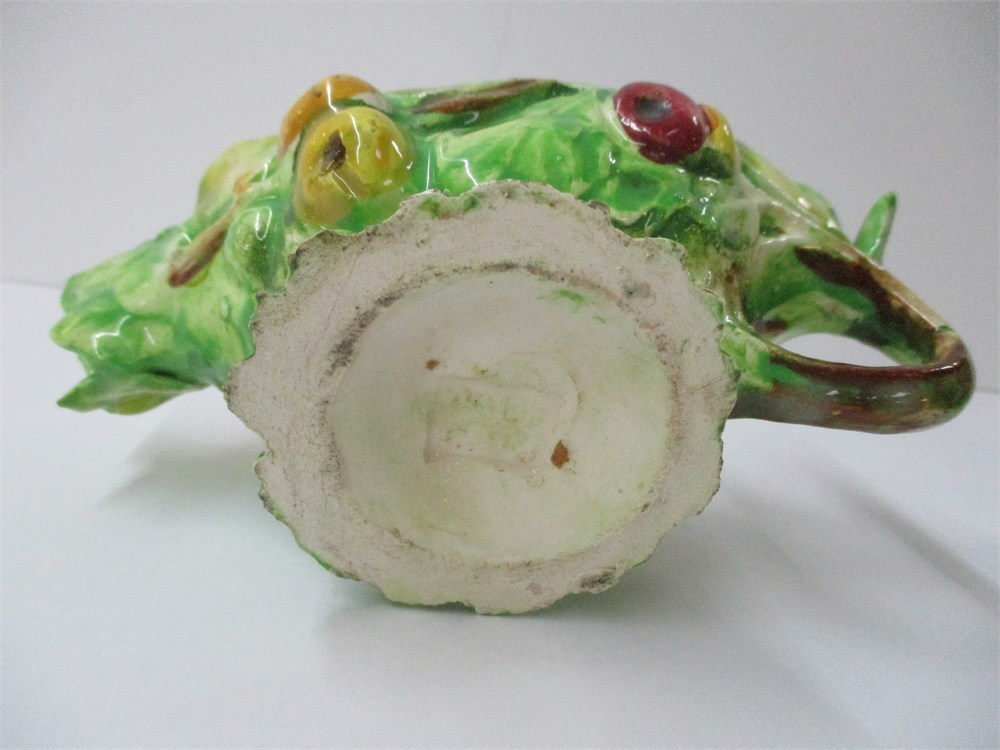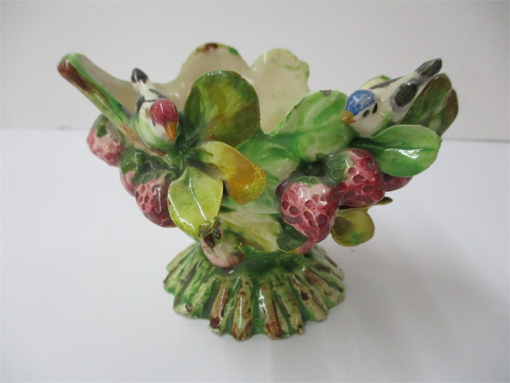 Vintage Majolica pieces with birds, leaves and berries, possibly a creamer & sugar?  In very good vintage condition. Larger piece measures 6 x 3 x 2.5" and the smaller 4.5 x 3 x 3".