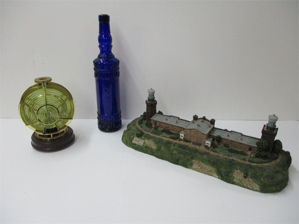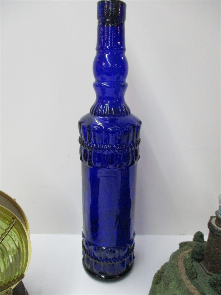 a very nice vintage lot of a Blue Tall neck Bottle, made in Spain, 13" tall, a replica of the Navesink Twin Lighthouse in N.J. dated 1996 and numbered #5239, 17" x 7",  and a miniature Harbour Light on stand, 8" tall.