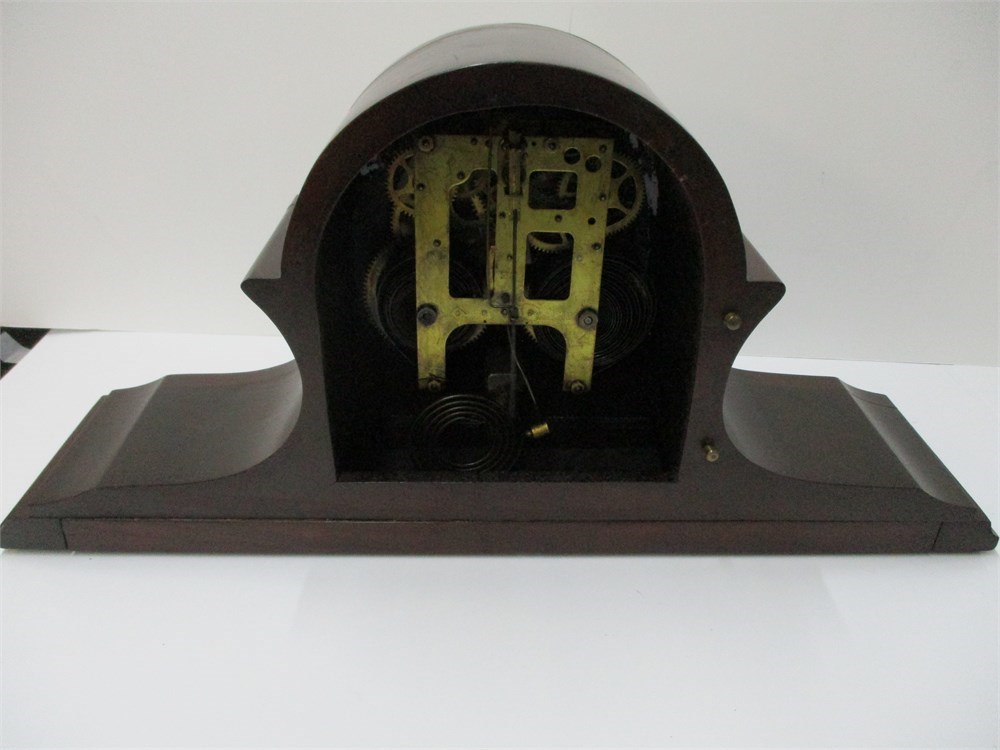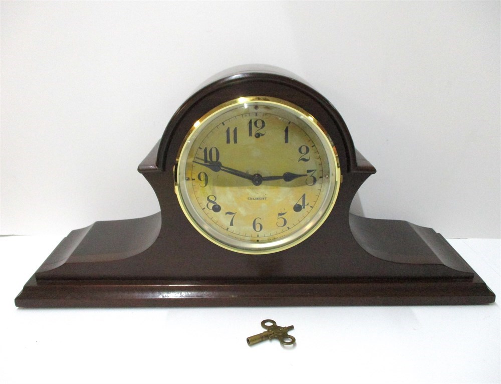 Vintage, Gilbert Mahogany Mantel Clock with Key.  It is is very nice vintage condition with only normal age related wear.  It winds as it should. It measures 20" x 9.5" x 5.5".  It is in working condition at time of listing, but cannot guarantee.