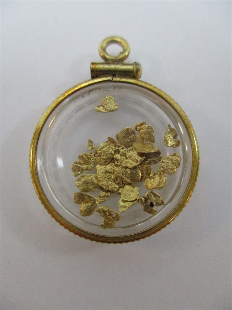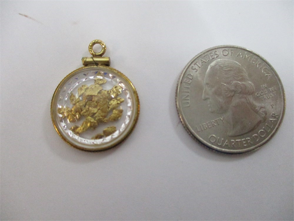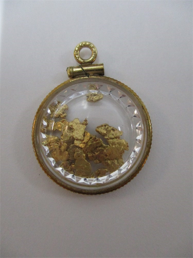 A lovely round vintage, 1/20/12K GF, Glass Pendant w/Floating Gold Flakes. A souvenir from Alaska or Colorado, 1940-1970's.