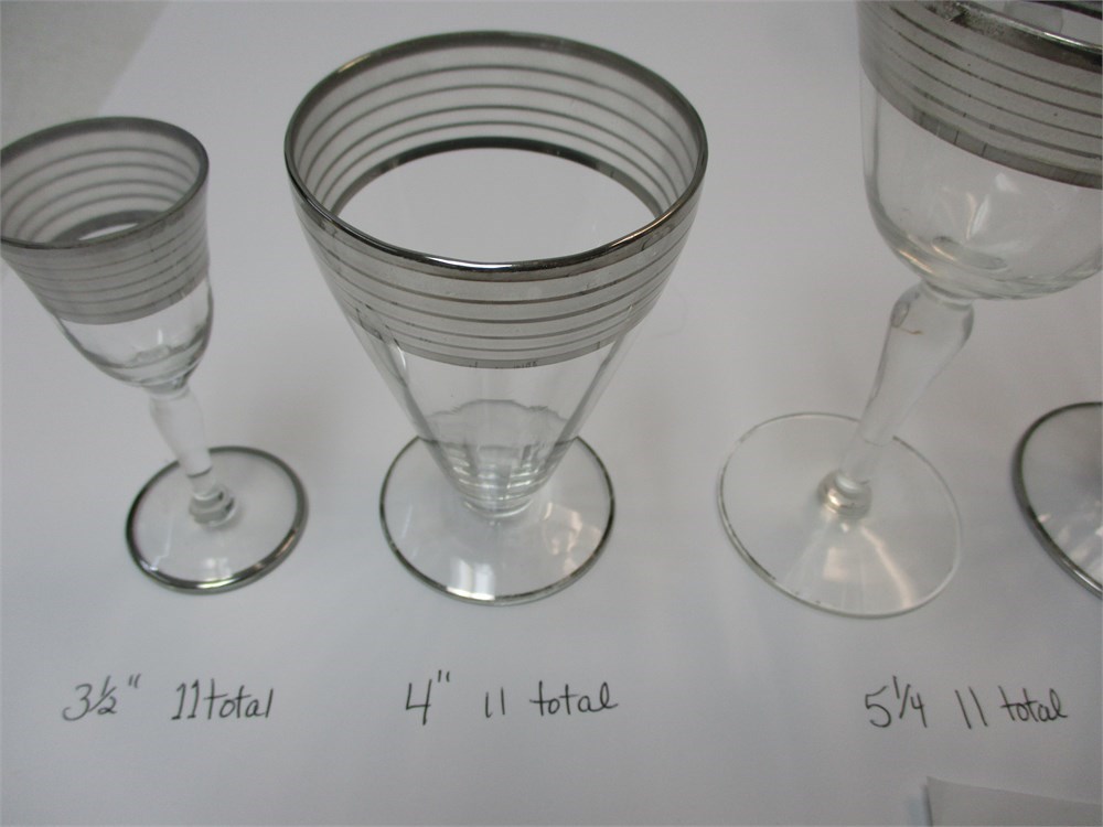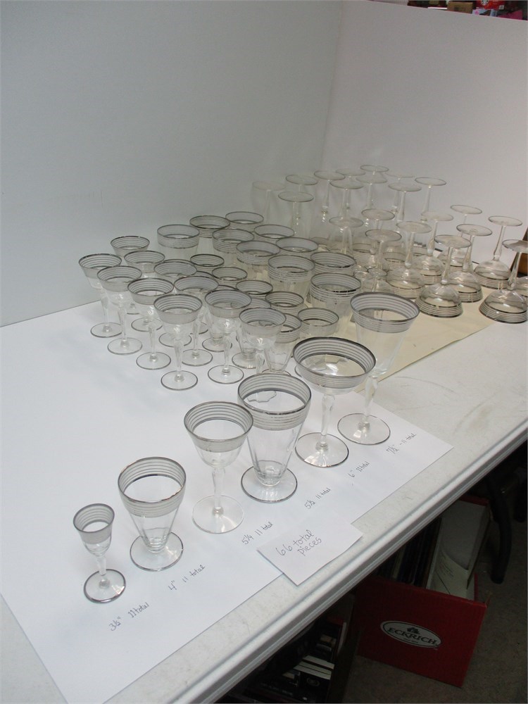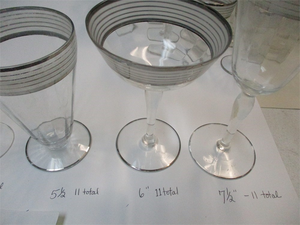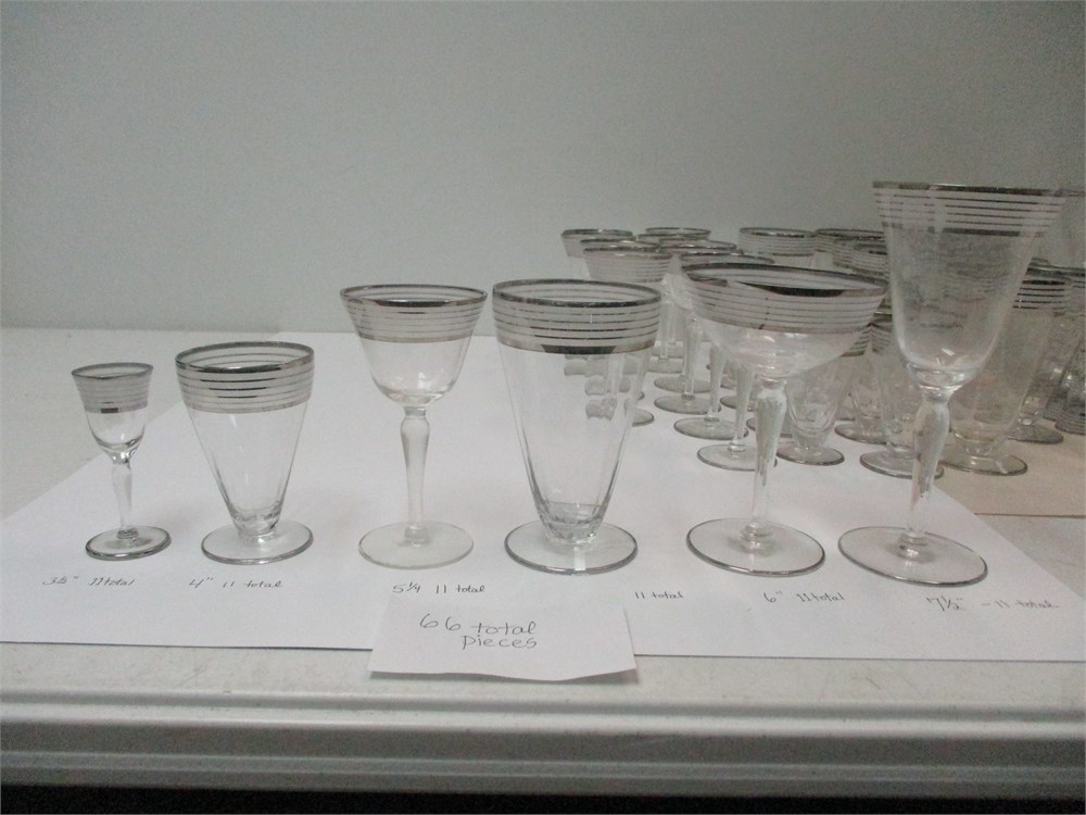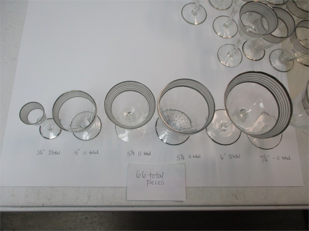 A 66 Piece Vintage Lot, Assorted Stemware w/Silver Trim.  11 of each size and purpose.  3.5", 4", 5.25", 5.5", 6", 7.5".  All in very nice gently used condition.