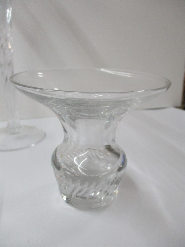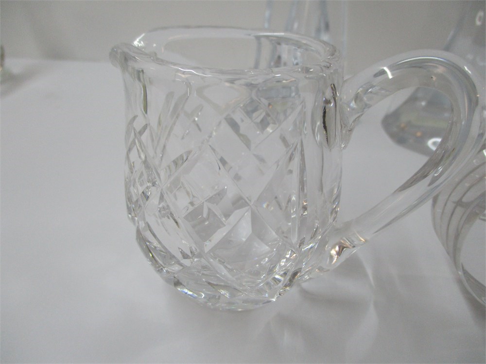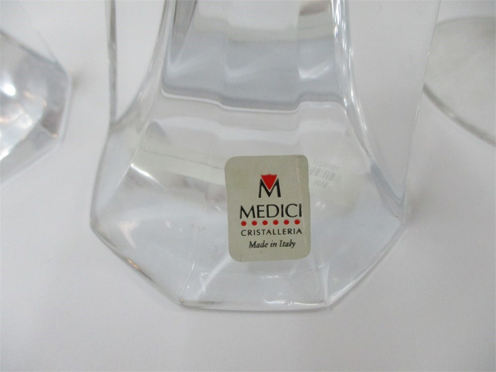 The Gorgeous glass lot consists of a pair of Medici Italy Candlesticks, 8" tall, a small Waterford? pitcher, a small Waterford dresser clock, and two more candlesticks unmarked, the largest measuring 10" tall.   All pieces are in very nice vintage condition. Unsure of working condition of the clock.