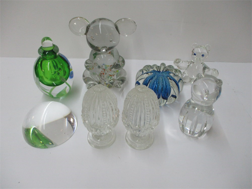 This wonderful lot consists of T.J. Bears, Spode Cat, Beautiful Art glass Green Perfume with clear Dauber, 2 carved glass Pineapples, a clear round Magnifier and Art glass paperweight.  The tallest piece is the Bear and measures 5" tall. All in very nice condition.