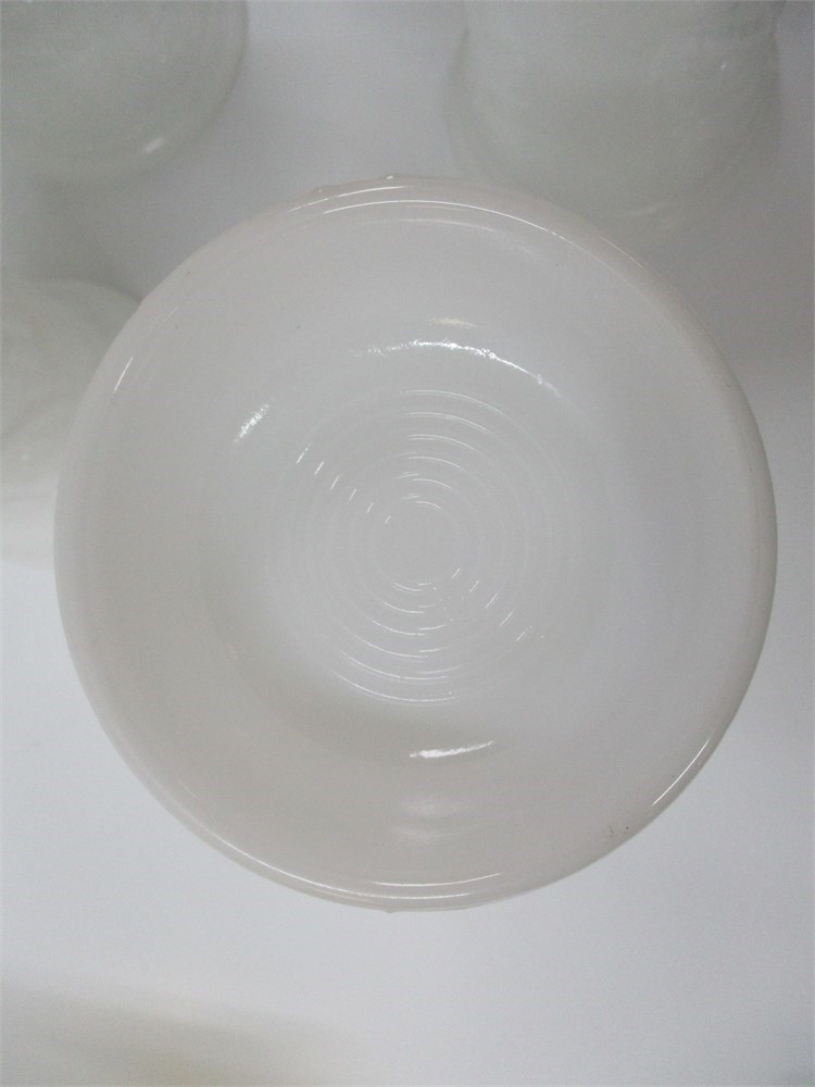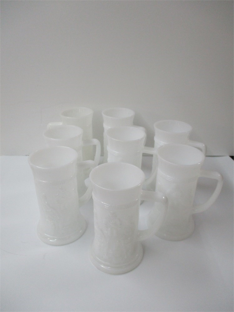 This wonderful lot is a 8 piece set of  Vintage Federal Milk Glass Beer Steins with a Tavern Scene.  Each scene is the same.  Each Stein measures approximately 6" tall.  all in very nice condition.