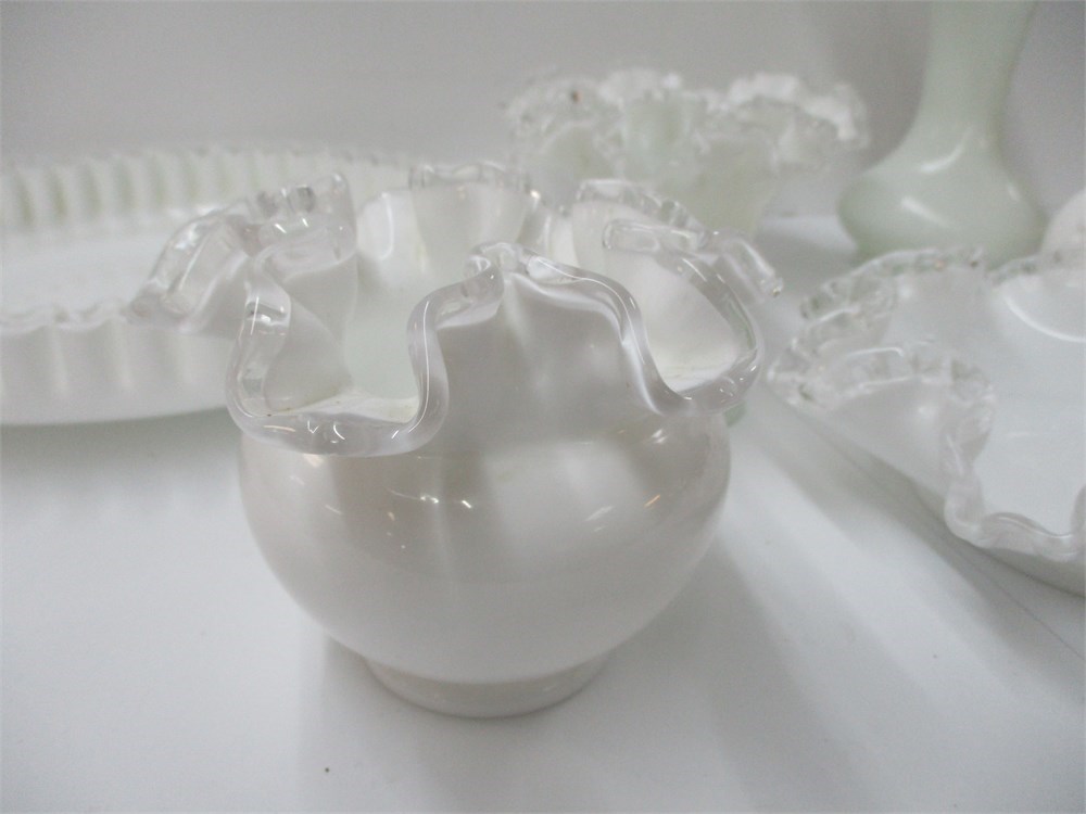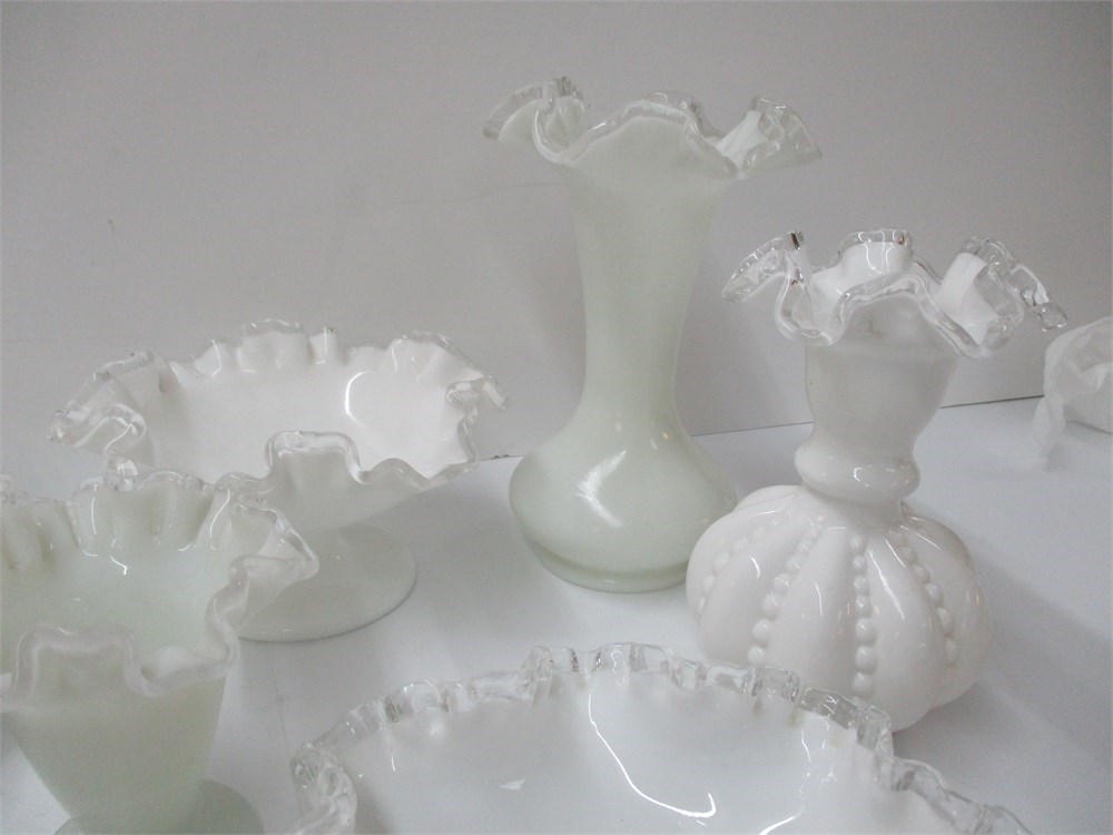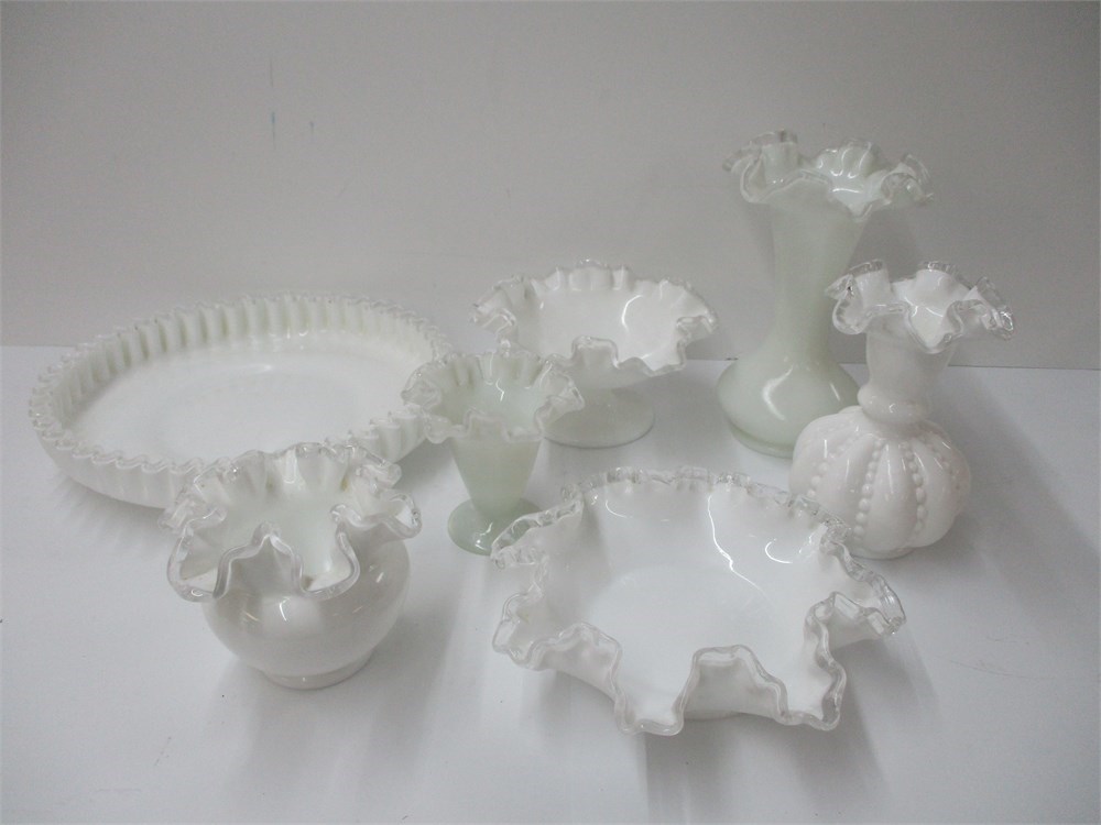 A lovely 7 piece lot of Fenton Silvercrest Ruffled Milk Glass assortment.  Pie Plate, Vases and Bowls.  Pie Plate measures 10.5" across.  Largest Vase 8" high.