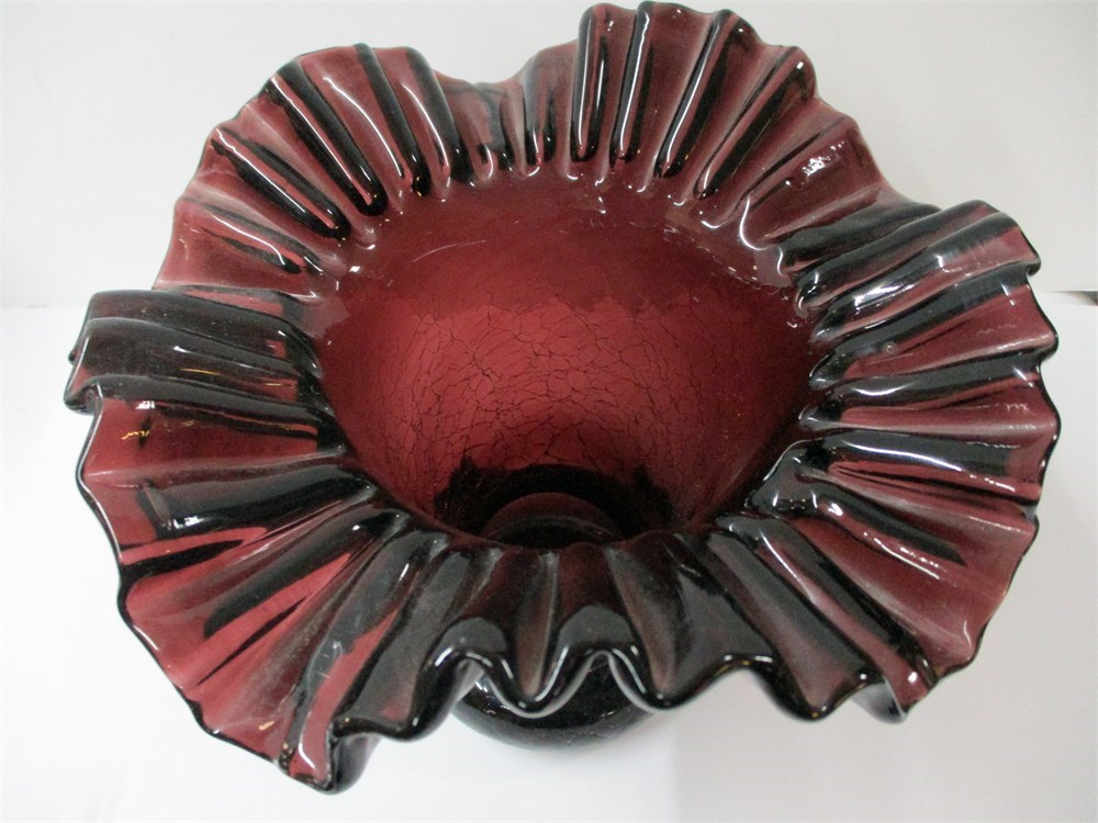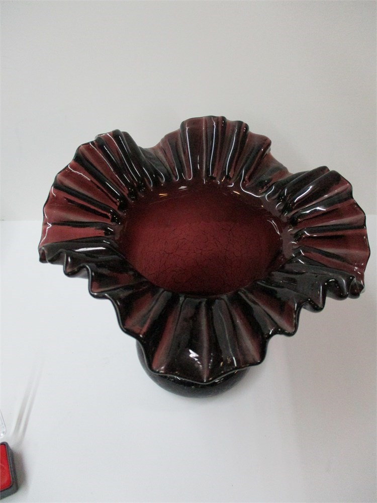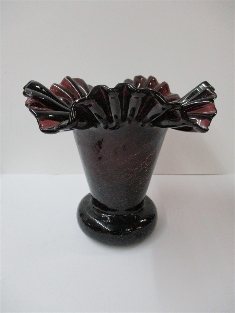 This is a lovely vintage 1940's Beacon Hand Blown Vase in a deep, rich, purple amethyst color.  It has an inherent crackle finish in the body of the vase and the ruffle edging softens the whole piece.  It is a lovely vase that stands 9.5" tall.