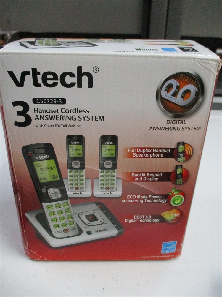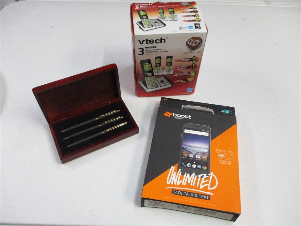 This lot consists of a 3 Handset Cordless Phones w/ Answering system in original box, a Boost Mobile ZTE Prestige 2 4G LTE phone in original package unused, and a presentation box set of 3 Pens.  All in good condition.