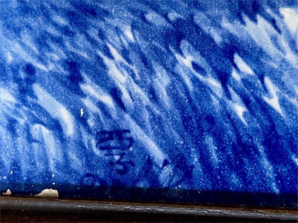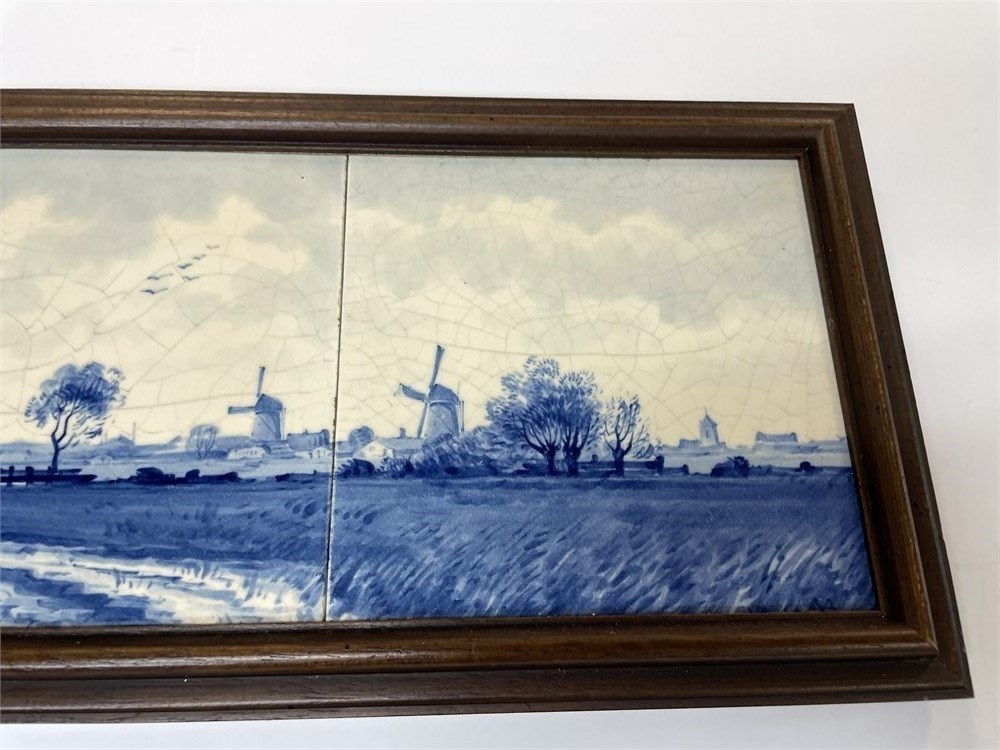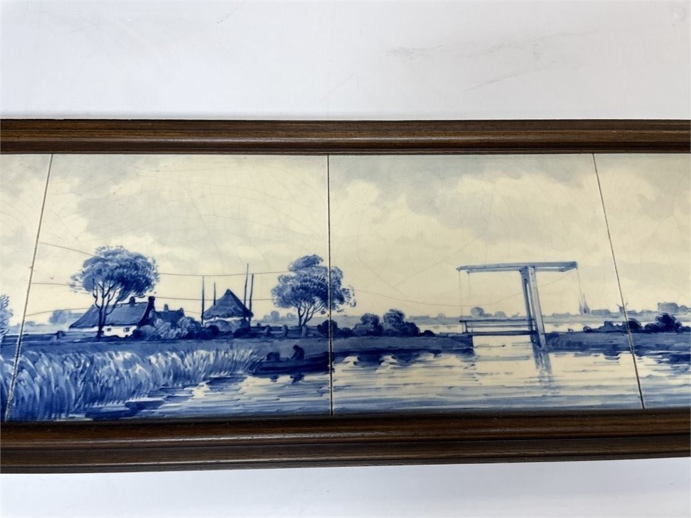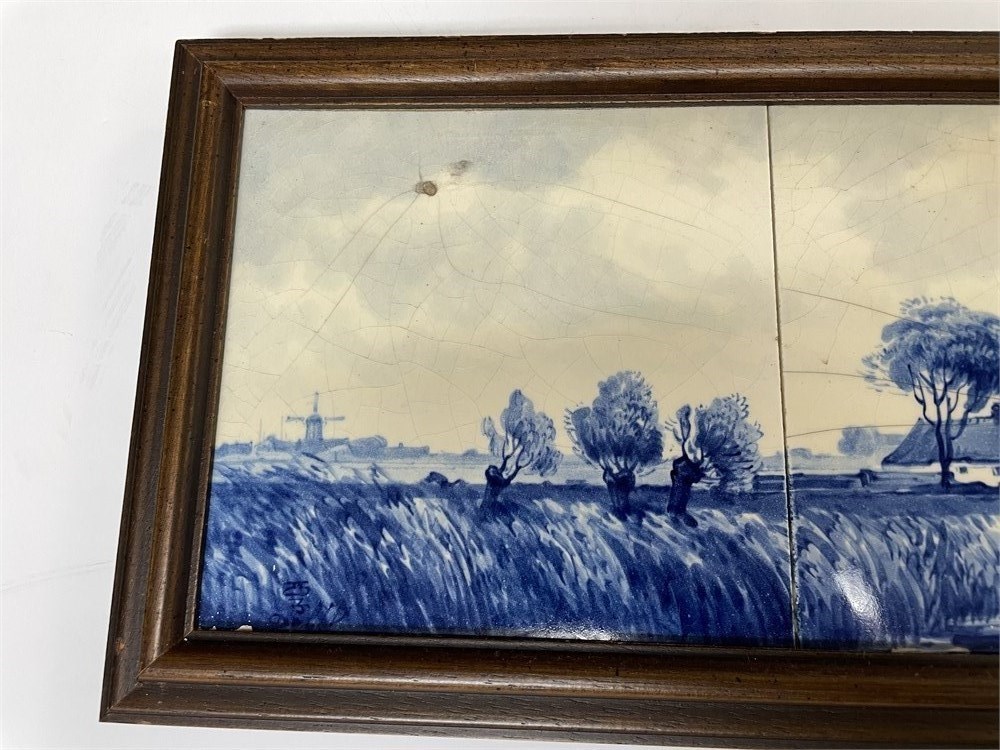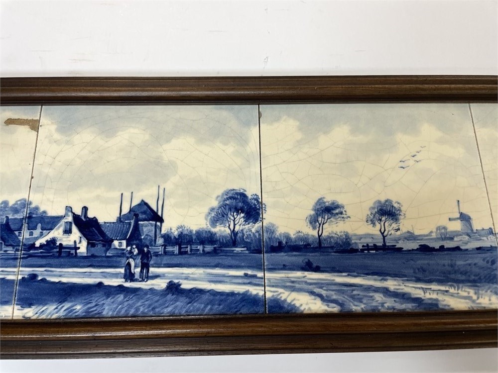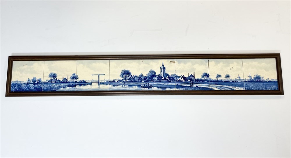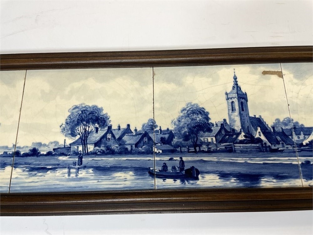 8 tiles comprise a framed harbor scene that is more than 4 ft long.  Delft porcelain, signed in lower left (see photo).  A couple tiles have some chips (surface loss), and there is crazing (age cracks) also.  See pics for details.