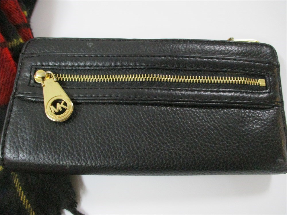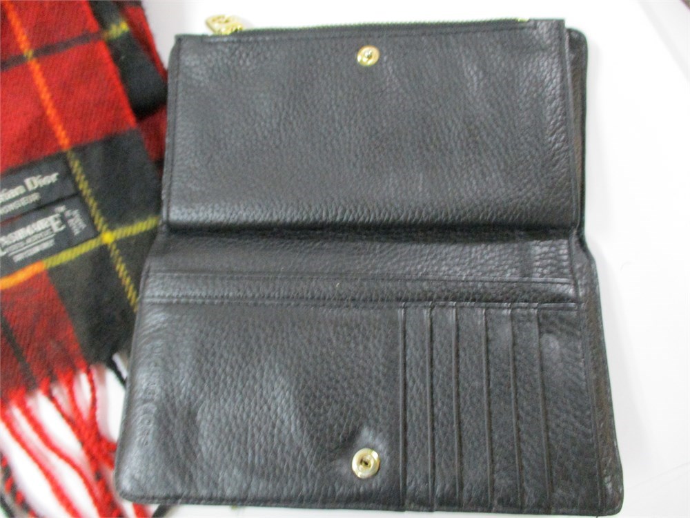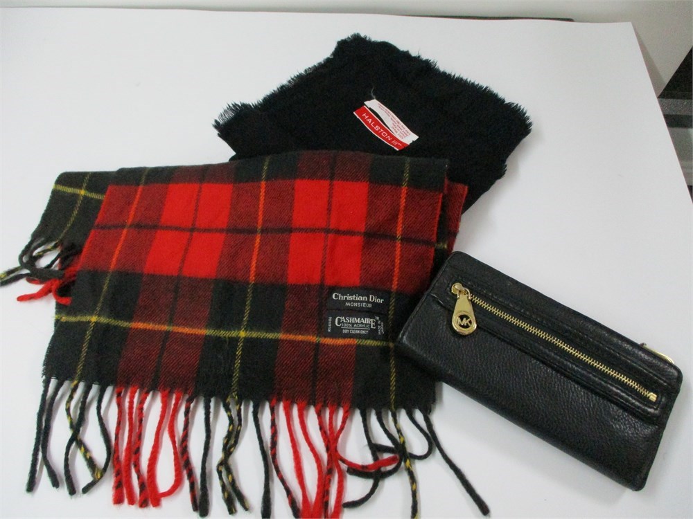 This lot consists of a Christian Dior Cashmaire Scarf 48 x 11.5", a Halston black square Scarf, 30" x 30" made in Italy 100% Wool and a Michael Kors Duofold black Wallet.  All in gently used condition.