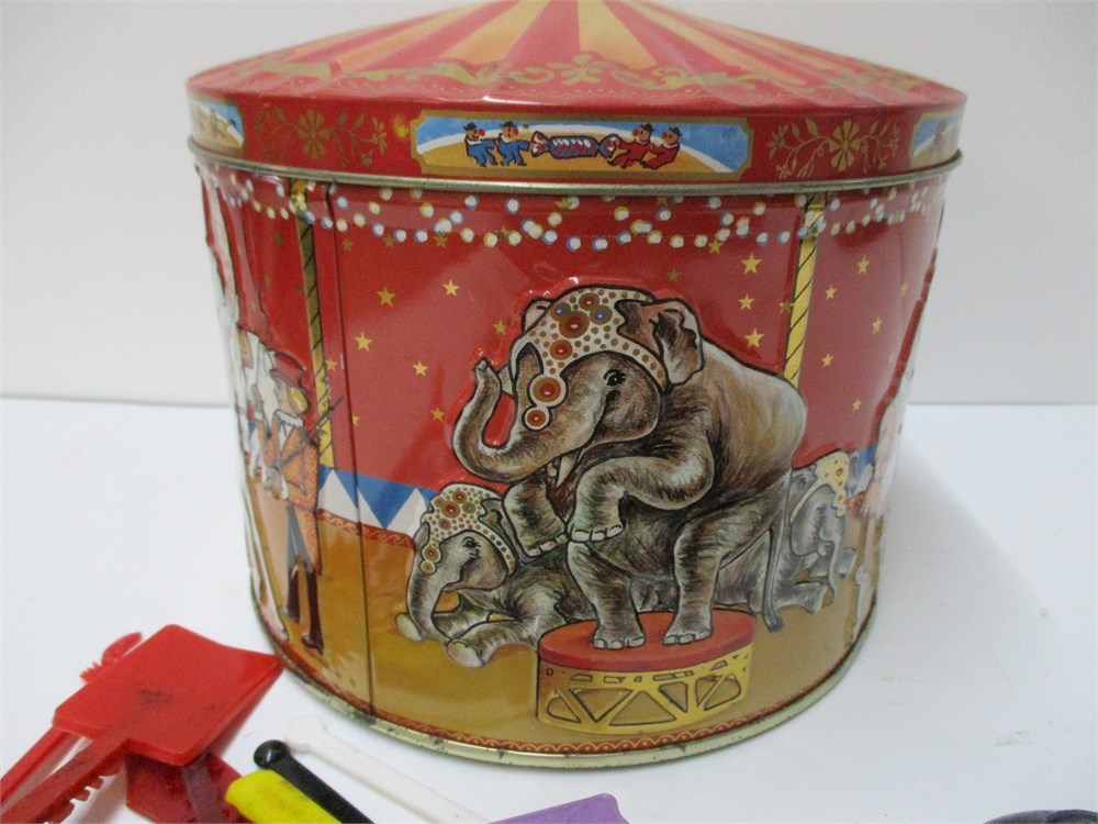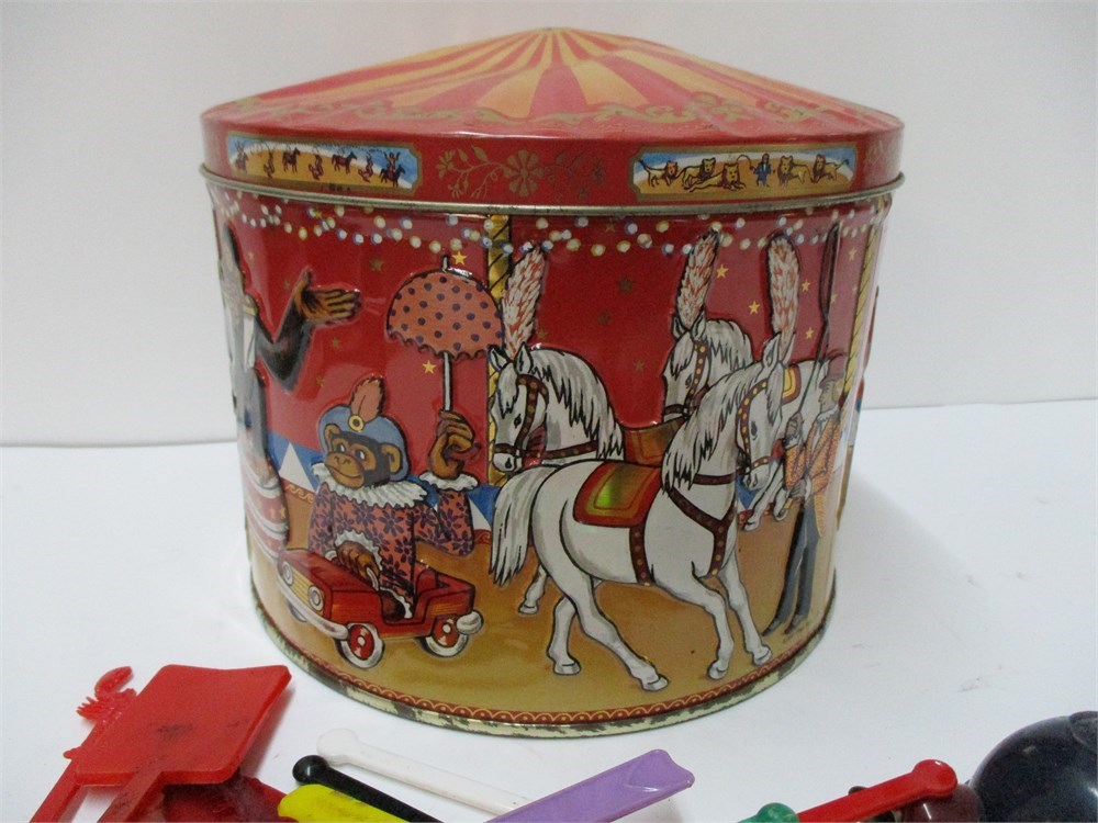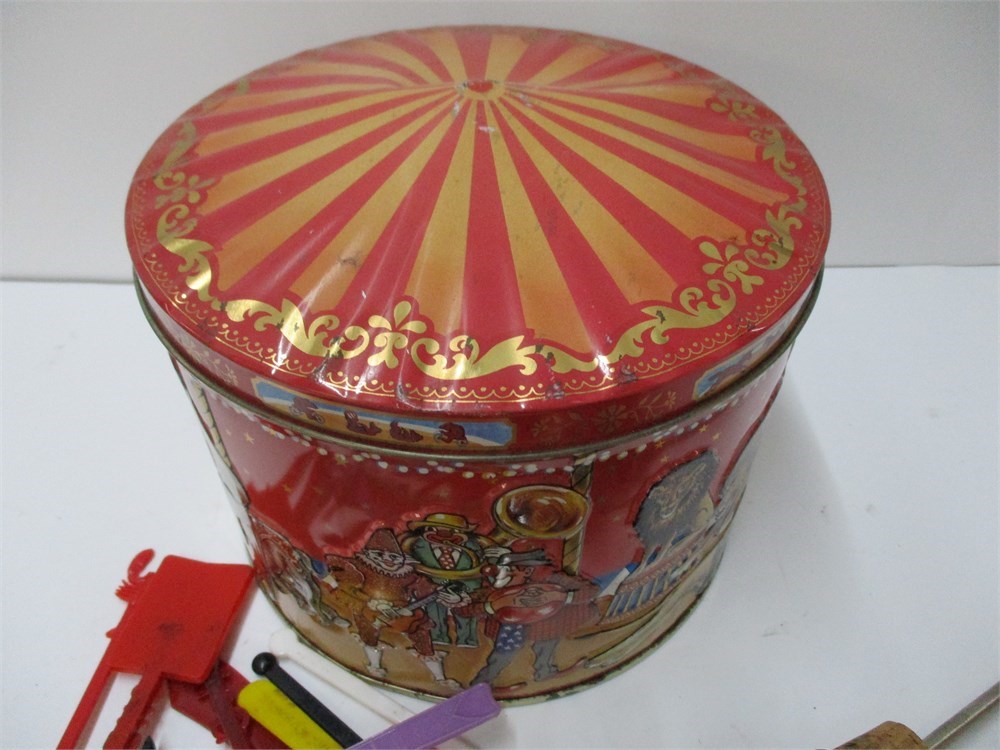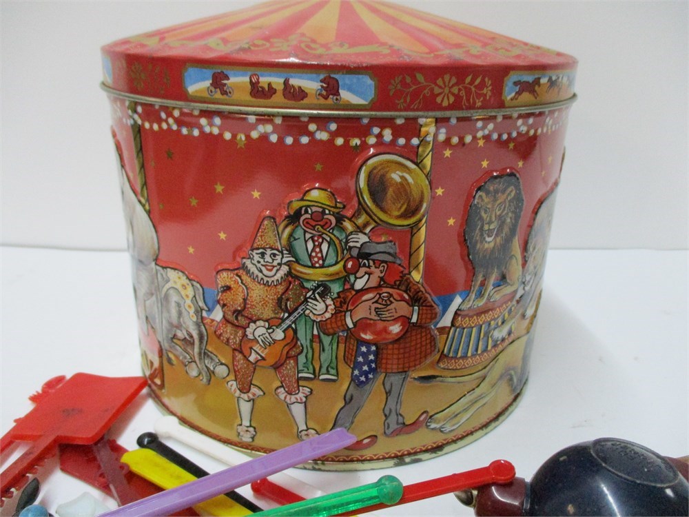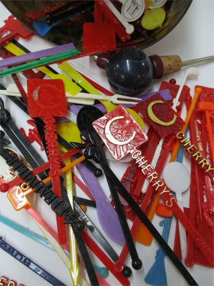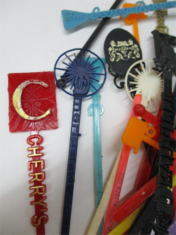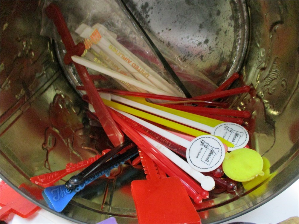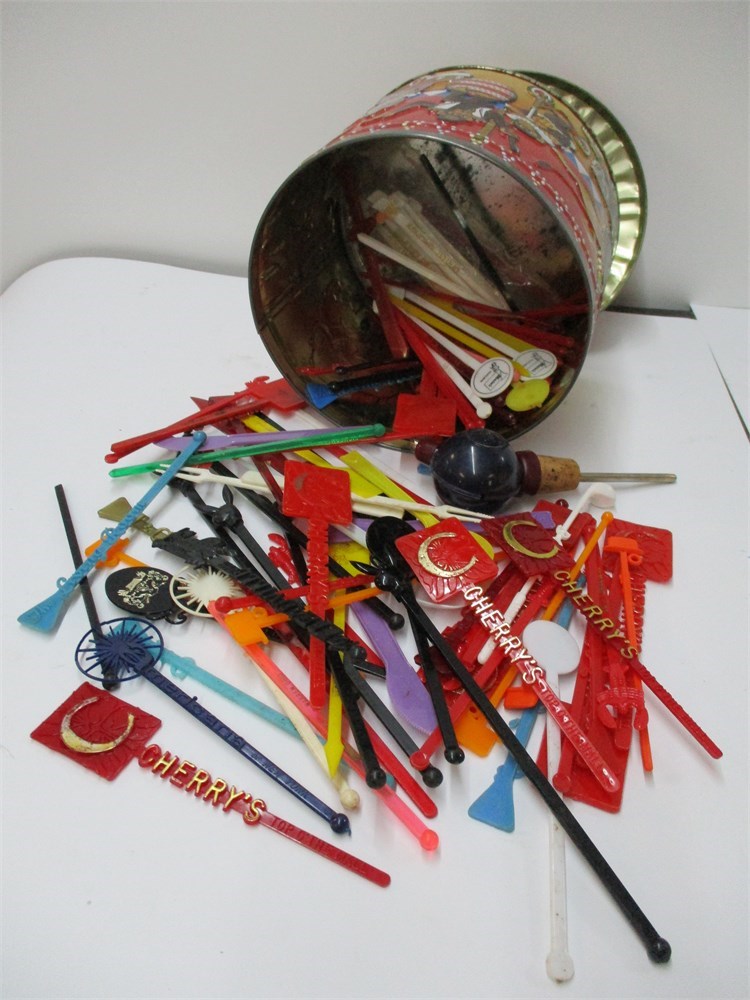 Huge Lot of Swizzle Sticks in a Vintage Circus Tin