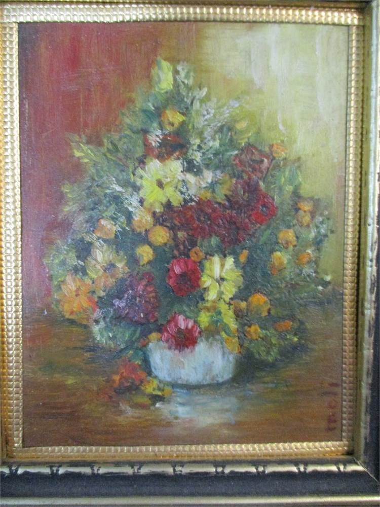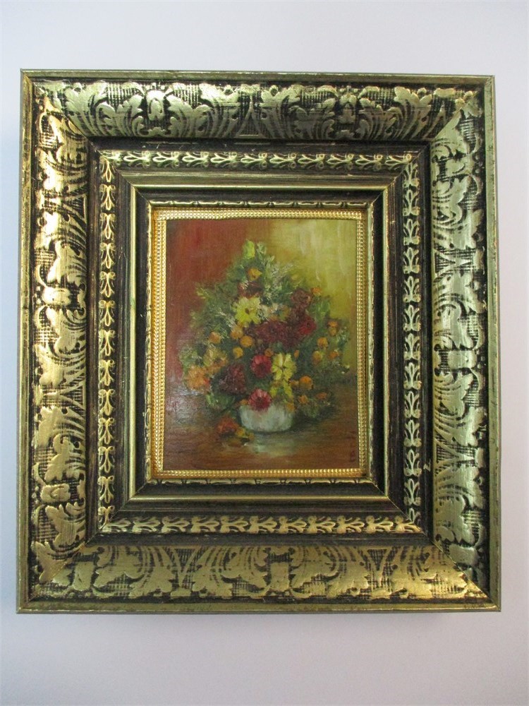 A wonderful small framed art oil on board of a Floral Bouquet.  Wonderful colors and the perfect size, 8 x 9.  Nicely framed  and ready for hanging!