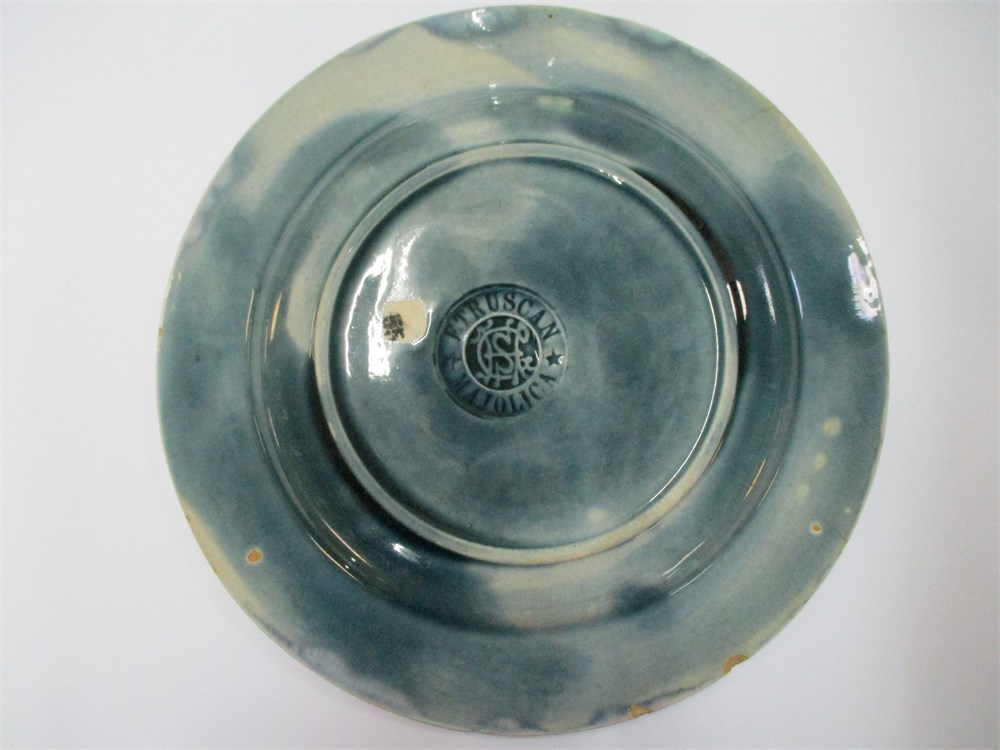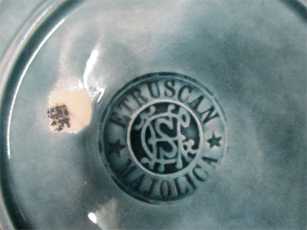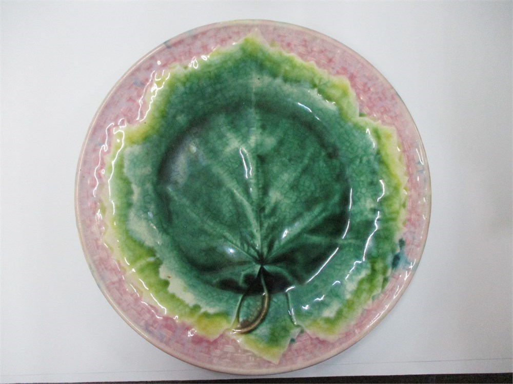 This is a wonderful Etruscan Majolica Plate centered with a Maple Leaf on a Basketweave background.  It is hallmarked on the back in in very nice vintage condition. 8".